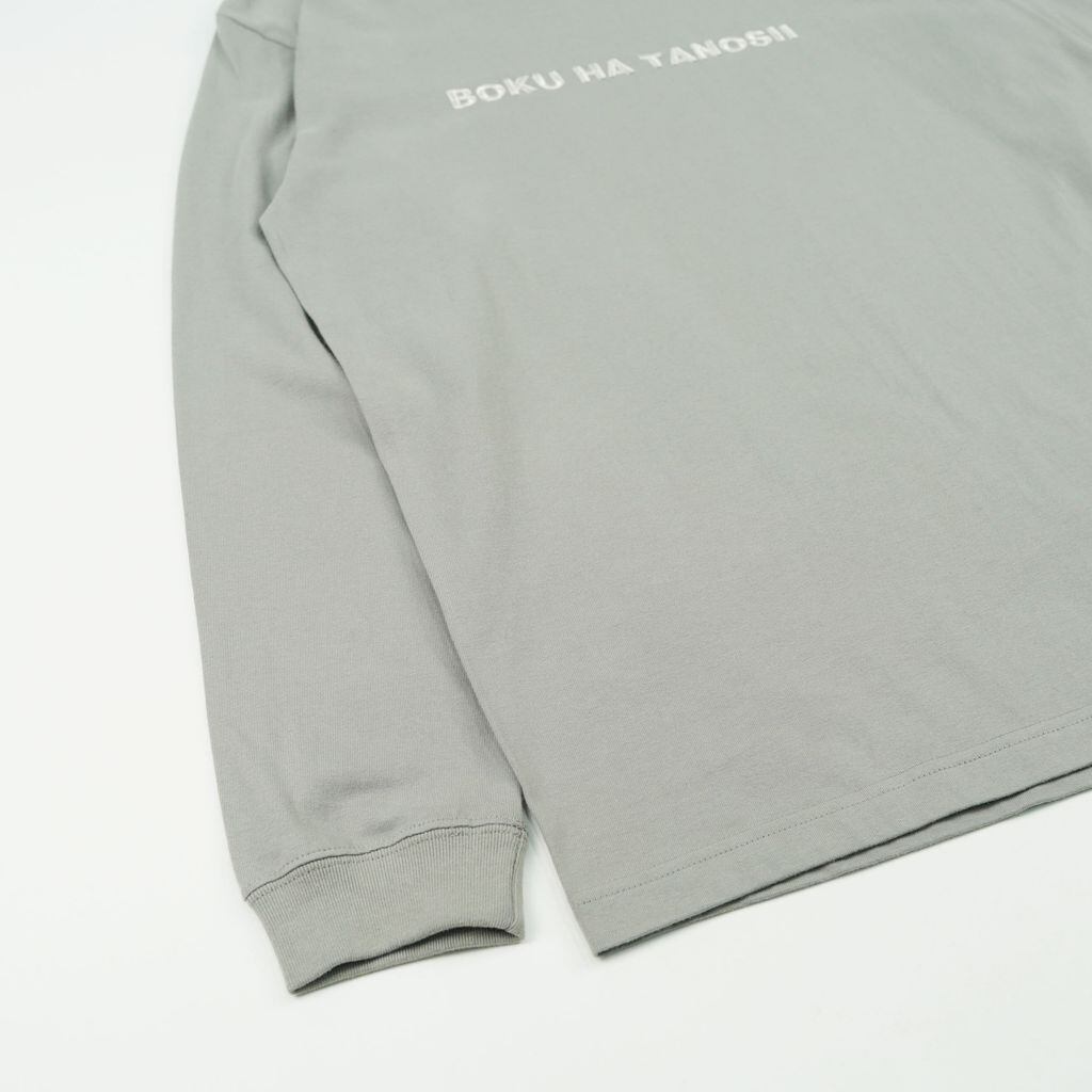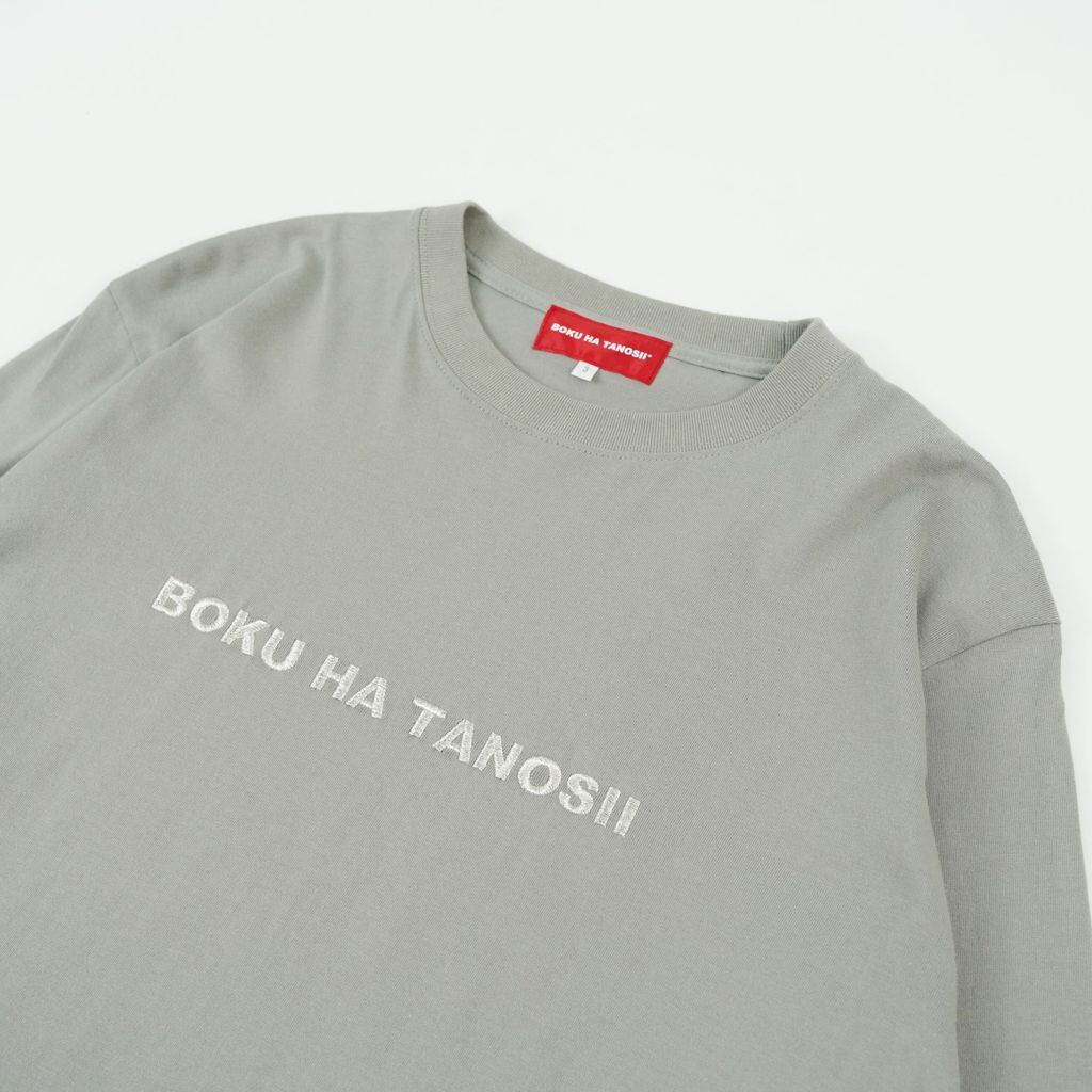 ストーングレーボディに銀糸の刺繍で施されたBOKU HA TANOSII