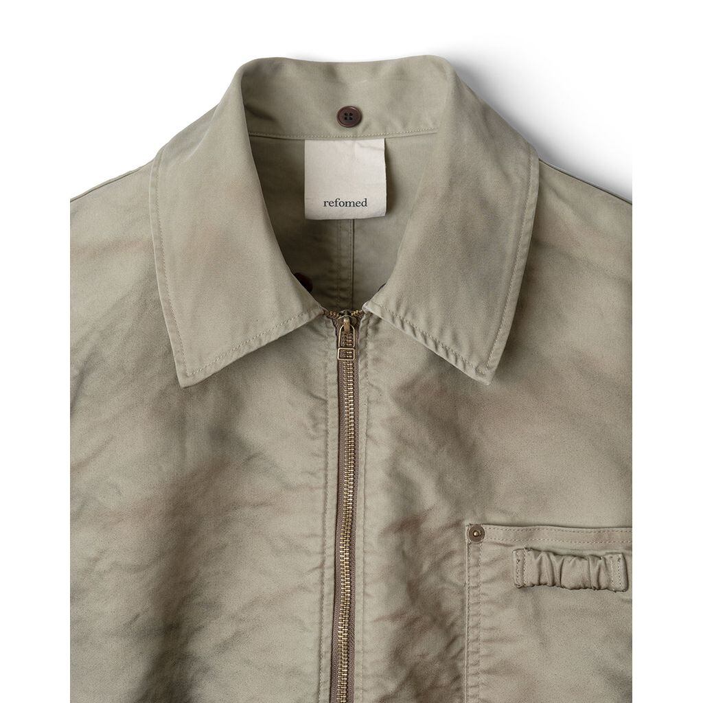 50年代のヴィンテージスタイルをベースに、refomedらしいミニマルなデザインへと再解釈した一着です。ポケットのディテールをあえて削ぎ落とし、より洗練された印象に仕上げています。また、ファスナー仕様を採用。左胸には、refomedの象徴ともいえるゴムディテールで表現したタグを配し、アイコニックなアクセントを加えました。