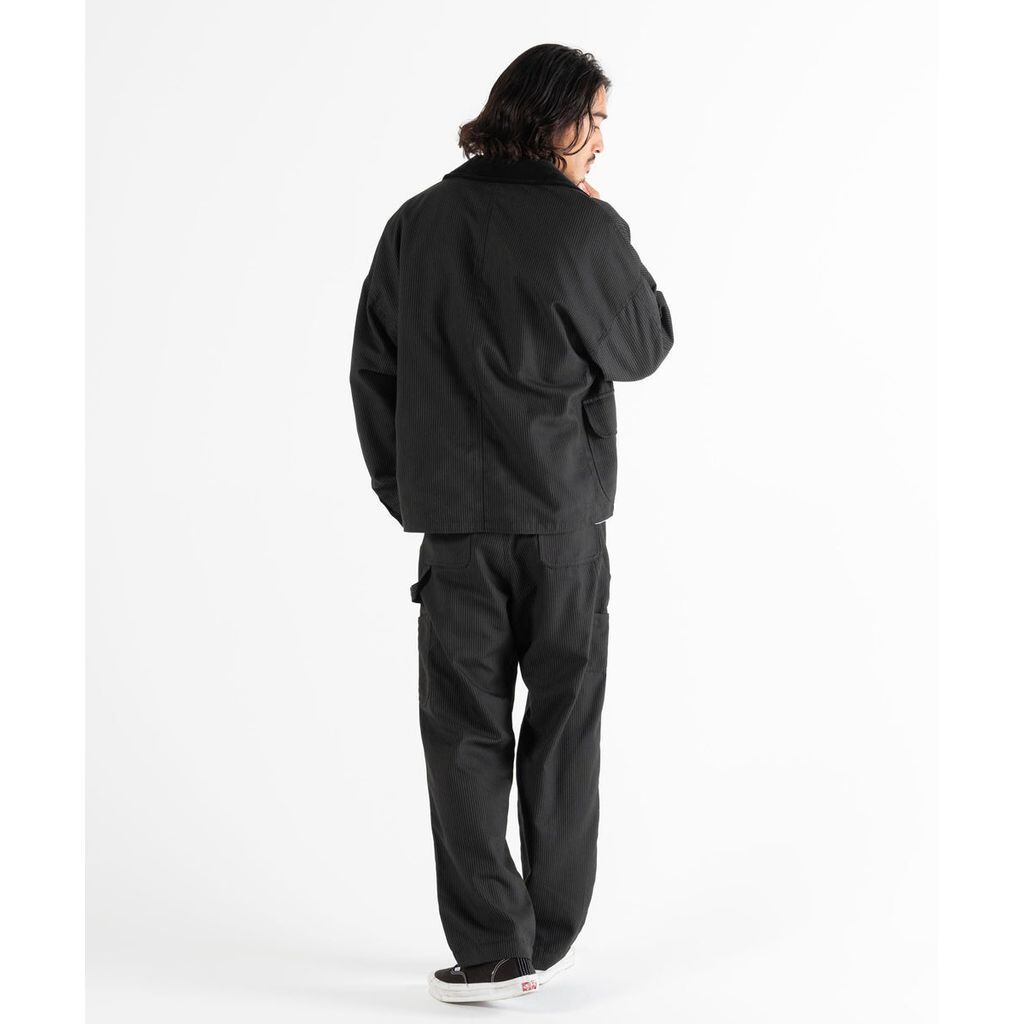 画家やペンキ塗りの職人が用いる作業パンツ、ペインターパンツをアップデート。あえてスーツに用いられるウール混のような質感を感じられるポリエステル・レーヨン素材を採用することでワーク的なアイテムをフォーマルに昇華させている。ワーク系アイテムの良い部分を残すため、ハンマーループ、ツールポケットのディテールは残している。