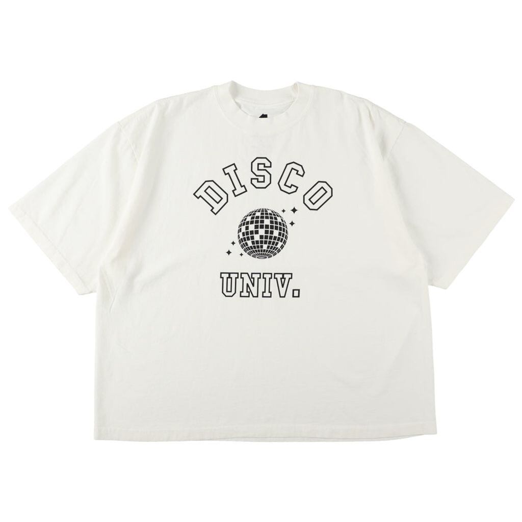 架空の音楽大学”DISCO UNIV”ユニフォーム。ミラーボールとカレッジフォントでデザインされたルーズフィットT-SHRTS。
