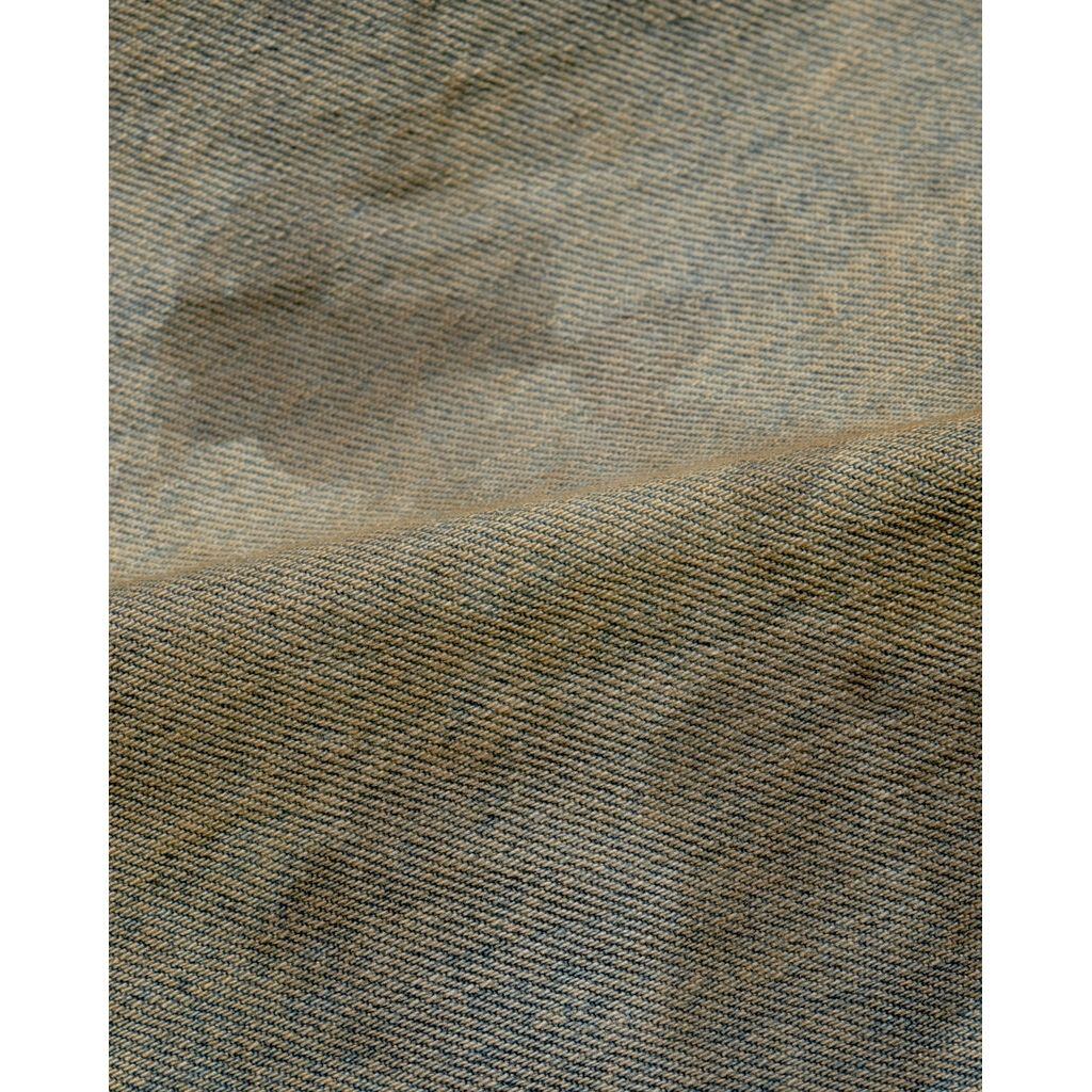 左手に材料を乗せ、右手で作業をする左官職人をイメージし、制作しました。 しゃがみながら作業をする姿勢で、左裾にパレットかのように材料をつけるシーンが印象的で制作に至りました。 素材は12.5ozセルビッチデニムを使用しています。当時の素材を再現する為にあえて染めムラが出来る様な染色を行った糸で織られています。
