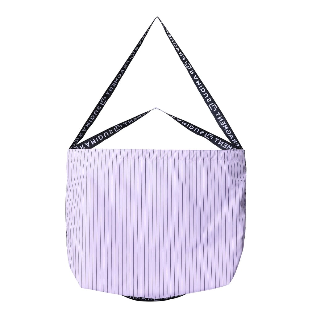 斜め掛け、肩掛けに対応したダブルストラップ仕様のショルダーバッグ。ストライプ生地の魅力を活かすため、アウトポケットを設けず、切り替えを最低限に抑えたデザインが特徴。1本のテープで切れ目無く構成されたショルダーストラップは、両ブランドのロゴがジャガード織りで表現されたfragment designとのコラボレーションを象徴する仕様。