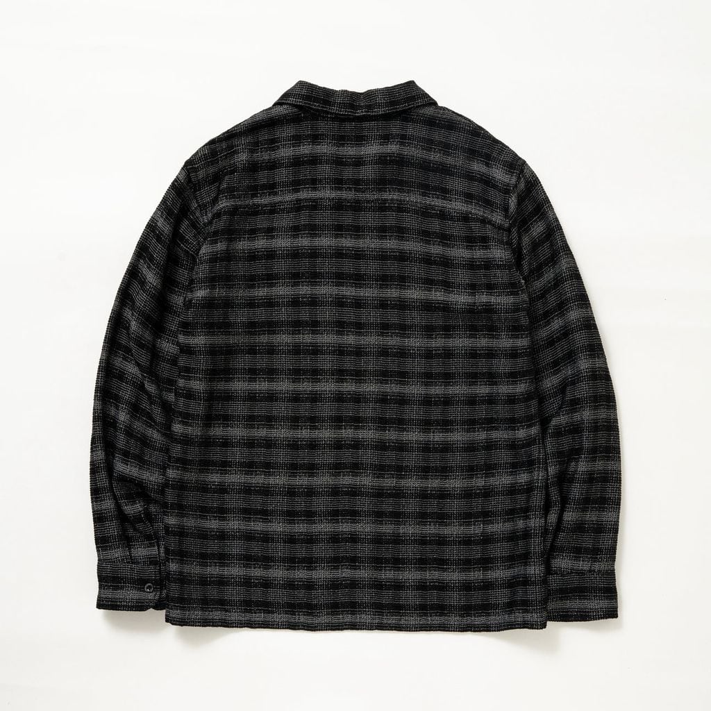 経糸にレーヨン/ポリエステルの混紡糸、緯糸にモールスキンを使用したオリジナル生地のオンブレチェック柄オープンカラーシャツ。緯糸にモールスキンを採用したことでハリ・コシに優れつつも、独特の柔らかな風合いに仕上がっている。左胸にパッチポケット、ポケット左縁にピスネームを挟み込み。裾はフラットなボックス型、レギュラーフィットシルエット。製品にてワンウォッシュ済み。