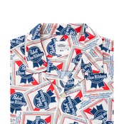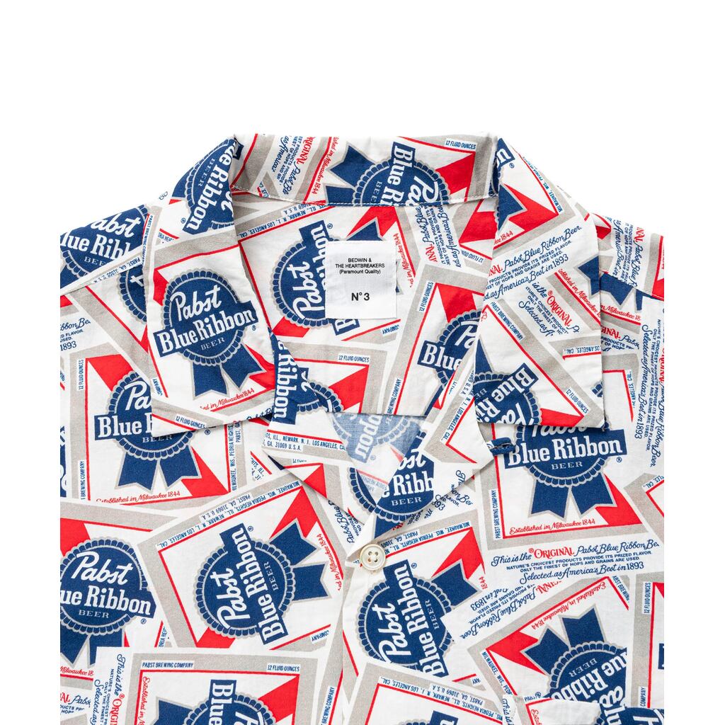 定番の綿レーヨンアロハシャツシリーズ。今季は、アメリカでトップ5の生産数を誇る実績を築きながらも、大手メーカーの傘下に入ることなくインディペンデントな運営を貫き、トラディショナルなビール醸造による安価で飲みやすいラガーを追求しアメリカの “大衆のビール”としての地位を確立した歴史の深いビアメーカとのコラボレーション。『Pabst Blue Ribbon』のアイコニックなロゴをコラージュしたオリジナル柄を作成。25SB4741とセットアップとして着用可能。