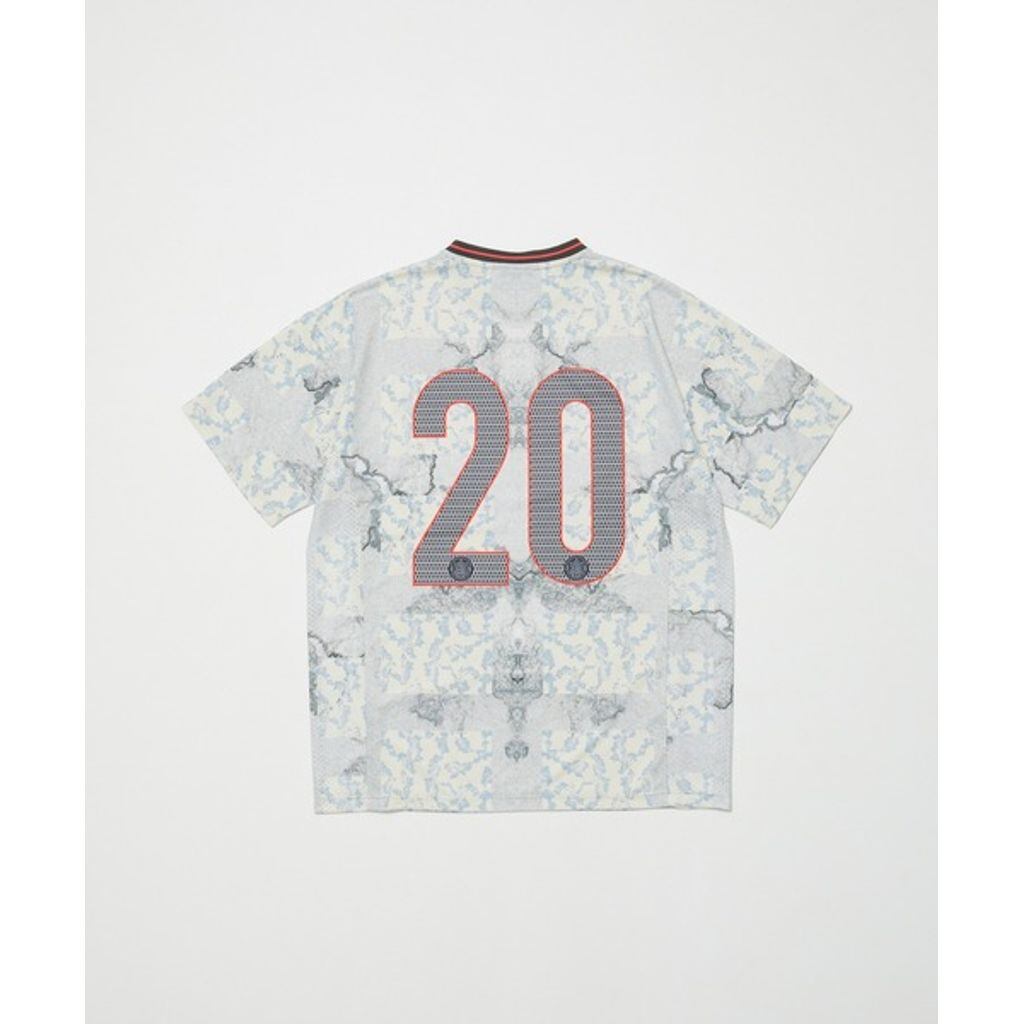 英国老舗スポーツブランドUMBRO社とのコラボレーションのサッカージャージ。オリジナルのグラフィック総柄テキスタイルとナンバリングプリント。吸水速乾機能のポリエステル素材。