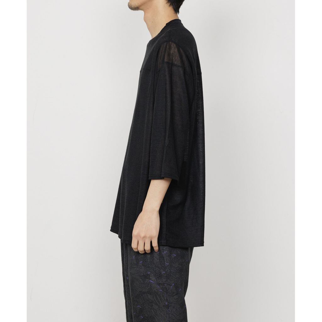 ゆったりとしたルーズフィットで、身幅、肩幅ともに大きくしています。袖丈を7部袖にし一枚でも様になるアイテムです。