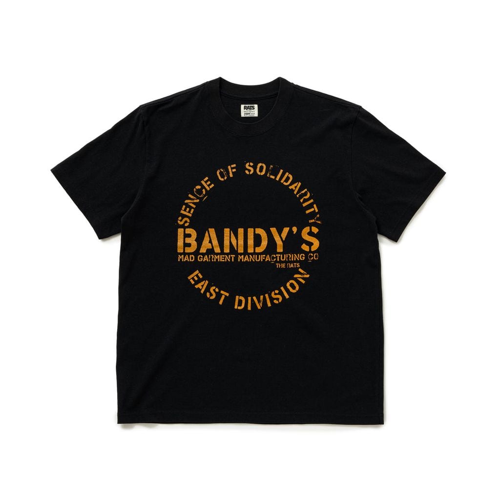 7.5oz.のコットン/キュプラの混紡天竺素材を使用したショートスリーブTシャツ。フロントに“BANDY’S”・“sence of solidarity ”・“EAST DIVISION”を組み合わせたサークル型レターグラフィックをラバープリントで表現したデザイン。背面右腰にRatモチーフのワンポイント刺繍。レギュラーフィットシルエット。製品にてワンウォッシュ済み。3色5サイズ展開。