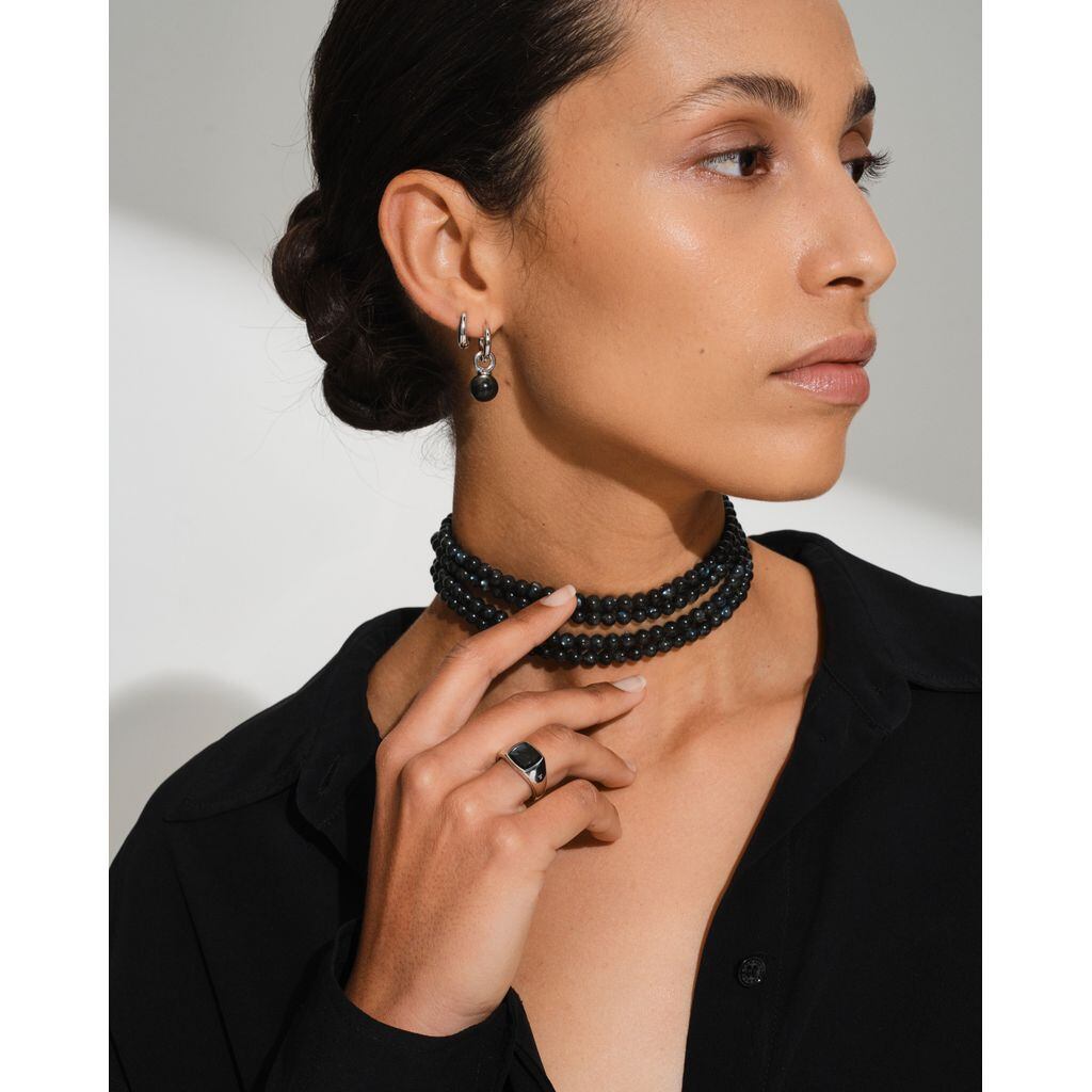 925スターリングシルバーにポリッシュ仕上げのロジウムメッキを施し、ブラックラルビカイトをあしらっています。すべての金属は100%リサイクル素材を使用しています。石は100%追跡可能で、ノルウェー、ラルヴィクのルンドス鉱山から直接調達されています。