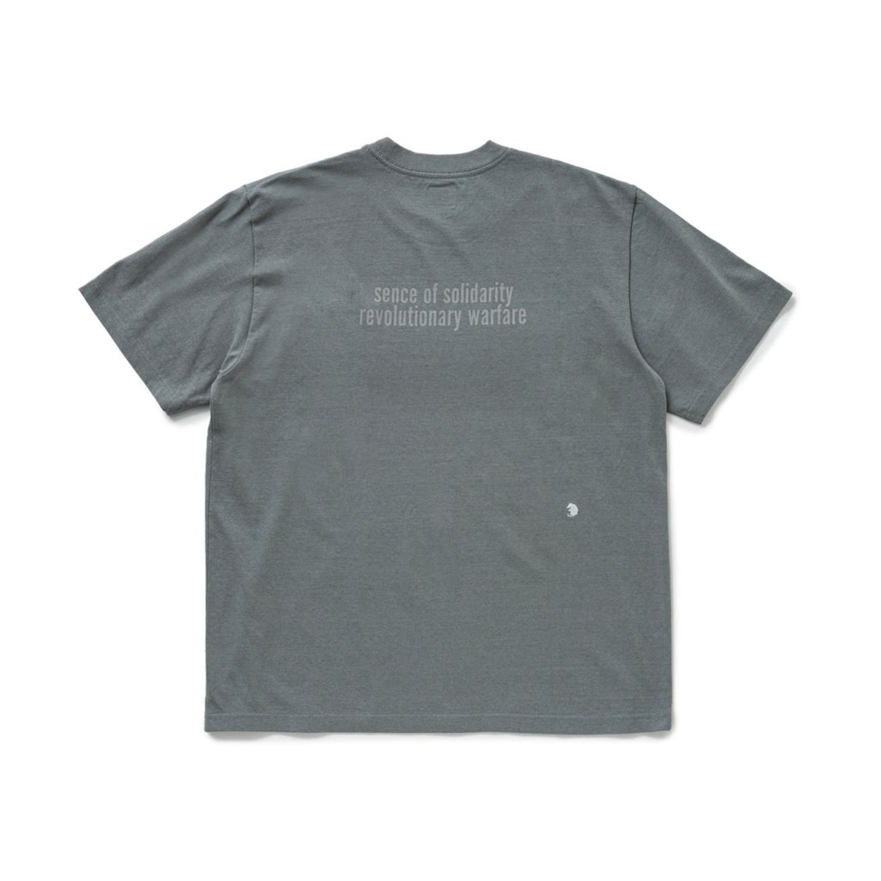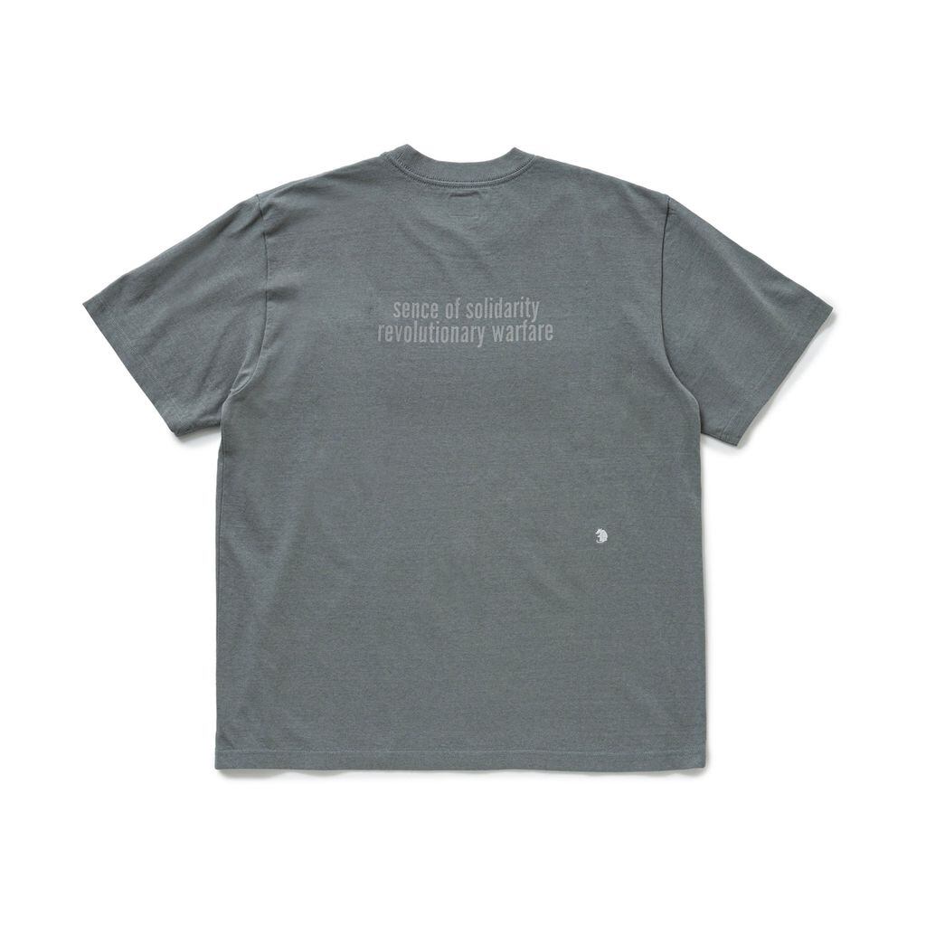 7.5oz.のコットン/キュプラの混紡天竺素材を使用したショートスリーブTシャツ。左胸にパッチポケットを配置。ポケット左上にRatモチーフ・サークル柄レターグラフィック、背面中央に“sence of solidarity ”・“revolution warfare”のレターグラフィックをラバープリント、背面右腰にRatモチーフのワンポイント刺繍。レギュラーフィットシルエット。製品にてワンウォッシュ済み。7色5サイズ展開。
