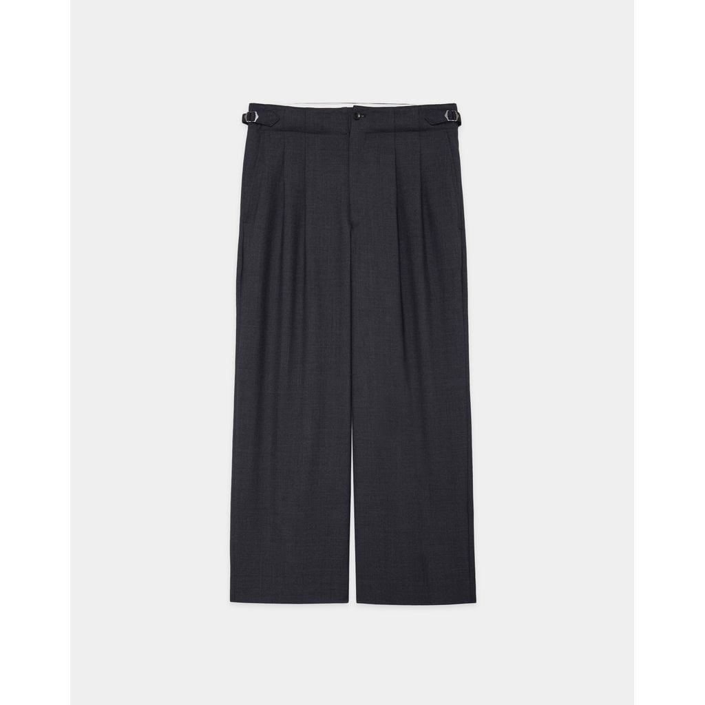 身頃続きのウェストデザインはそのままで、ベルトループを廃した代わりにサイドアジャスターを付与することで、体型に合わせた調節が可能です。2タックのワイドストレートシルエットが、トレンド感と快適さを兼ね備えています。