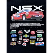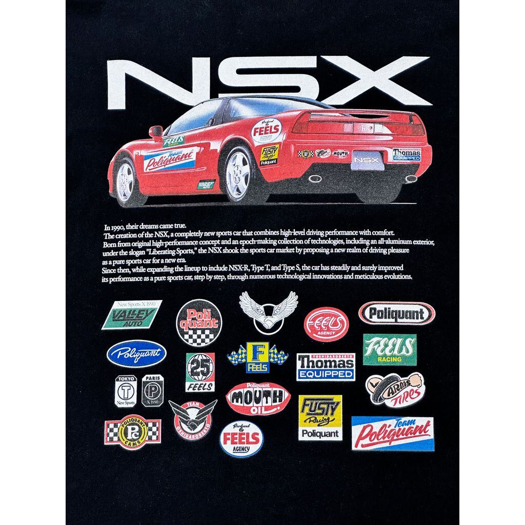 フロントにNew Sports X 1990のレターグラフィック、バックに初代NSXの車両とPORKCHOP GARAGE SUPPLYのデザイナーでもあるFUSTYWORKS 杉原氏が描き上げたレーシングカーカルチャーのグラフィックを組み合わせたデザインのプリントが入ります。