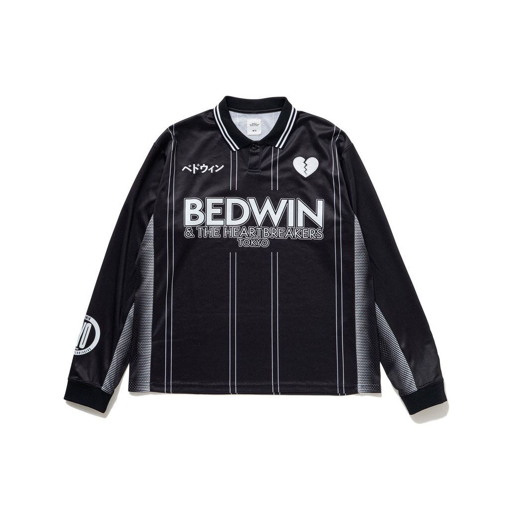 Bedwin & The Heartbreakersの架空のサッカーチームをイメージして作製した長袖ユニフォーム。本体には220gのポリエステル素材を使用し、両脇腹にはメッシュ素材を採用。フロントに大きくブランドロゴをプリント。両肩口にはそれぞれ刺繍で『ベドウィン』の文字とひび割れたハートを配置。右袖にはブランド名と都市コードをプリント。背中に背番号とハートモチーフをプリント。