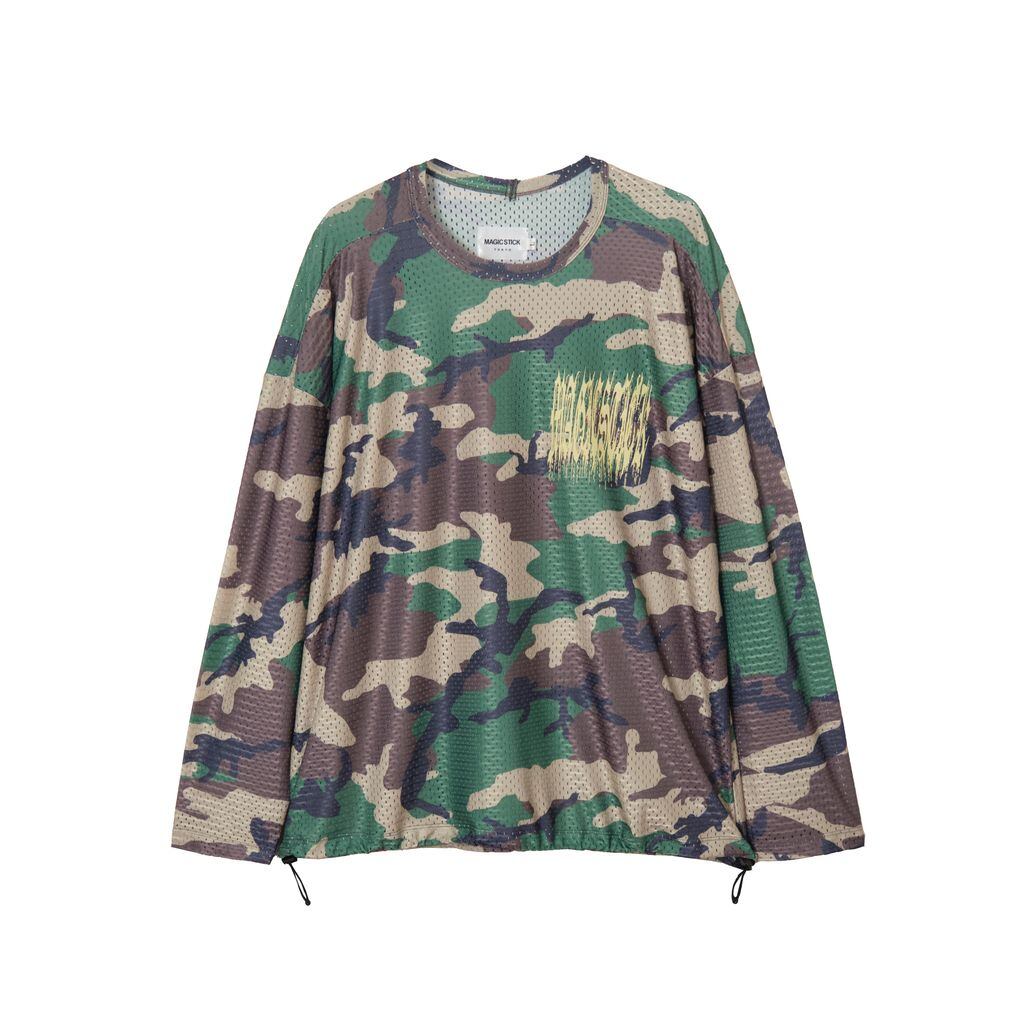 ウッドランドパターン、リアルツリーパターンをオリジナルで製作し昇華転写にてプリント。フロント、バックにはブランドらしい大胆なプリントが入る。