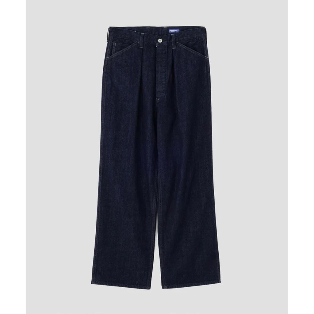 テキサス産オーガニックコットンを使用した、13.75オンスのデニムトラウザーズ。一般的なデニムよりも軽く柔らかな着心地で、着用を重ねることで繊細なタテ落ちが生まれる奥行きのある表情。混じり気のないインディゴブルーと、部位に応じて使い分けたネイビーと金茶のステッチが特徴。