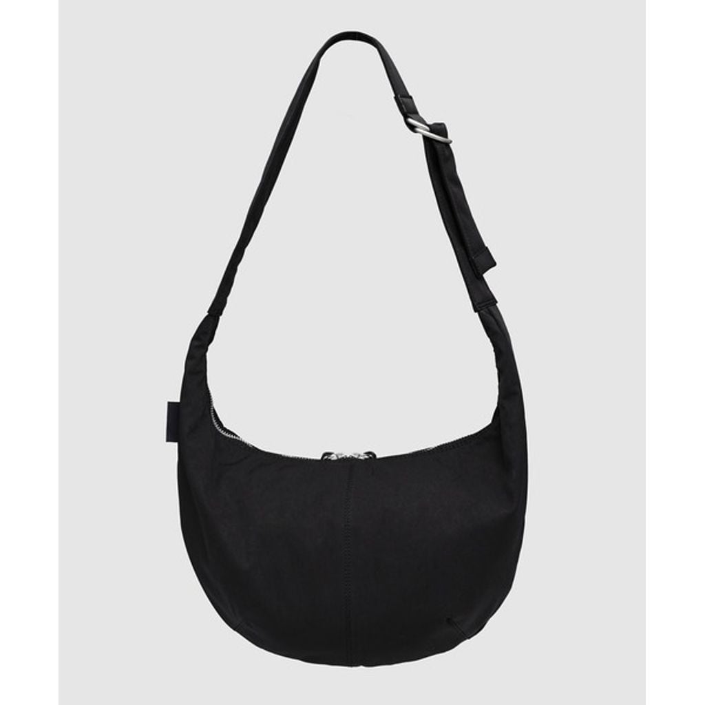 丸くラウンドしたボトムのデザインが特徴的なバッグは、斜め掛けで体に沿う様にデザインされたボディバッグタイプ。素材にはエステル素材のスエード生地を使用する事でカジュアルなアイテムでありながらも上品な印象に。またストラップ部分は長さ調整が可能なダブルリング使用となっており、体系に合わせた長さ調整が可能。ボディはスライダー付きのダブルジップ仕様になっているなどバッグとしてのデザイン性に機能性もプラスされたアイテムとなっています。