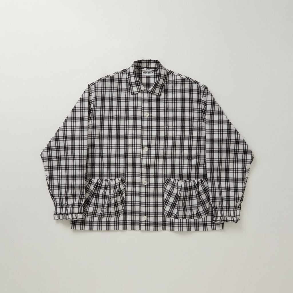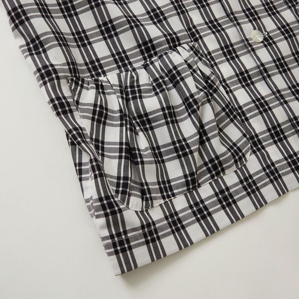 -袖のフリルとポケットのプリーツが特徴的なチェックシャツ。