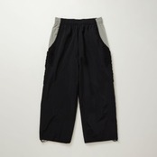 生地の切り替えしとポケット下のフリルが特徴的なナイロンパンツ。