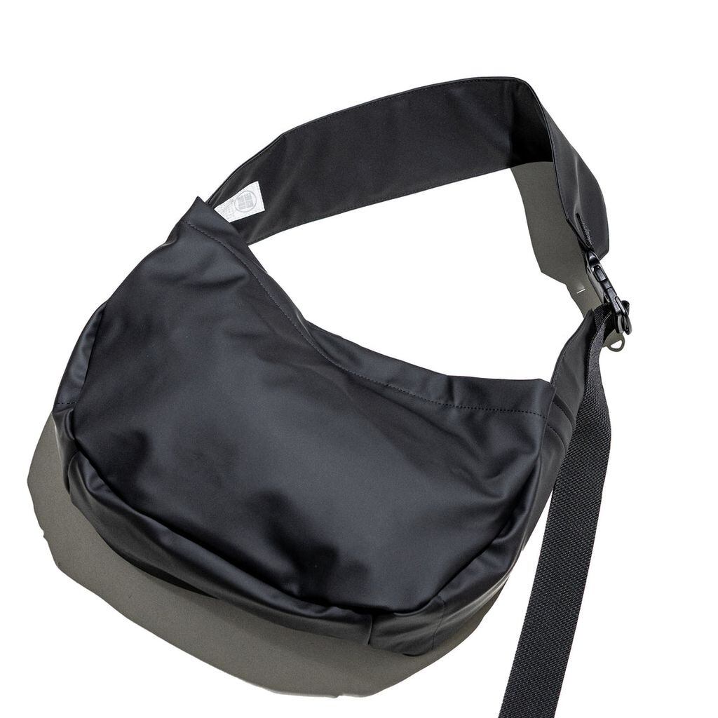 スライドタスキショルダー。その名の通り、YKKバックルをクイっと上げていただくと素早く、スムーズに長さ調節が可能となっており、モノの出し入れと、脱着が容易になっております。ショルダーテープを本体にまとめず、垂らす仕様です。ショルダー幅は12cm。ヴィジュアルインパクトありつつ、身体の負担を軽減する実用性も兼ね備えてあります。本体ボディは身体に掛けると体に沿って馴染む丸みを帯びたフォルムです。生地はポリカーボネートを使用。マットな表情。高耐久性と表面摩擦強度。通常のポリウレタンと比べ、高温多湿にも耐えます。PU特有の経年劣化にも強く、長くご使用いただけます。また環境に配慮された製法で作られた素材です。従来比70%のCO2排出量・揮発性有機溶剤約80%)。内装には手持ち用のハンドルがあり、トートバッグとしてもご使用いただけます。