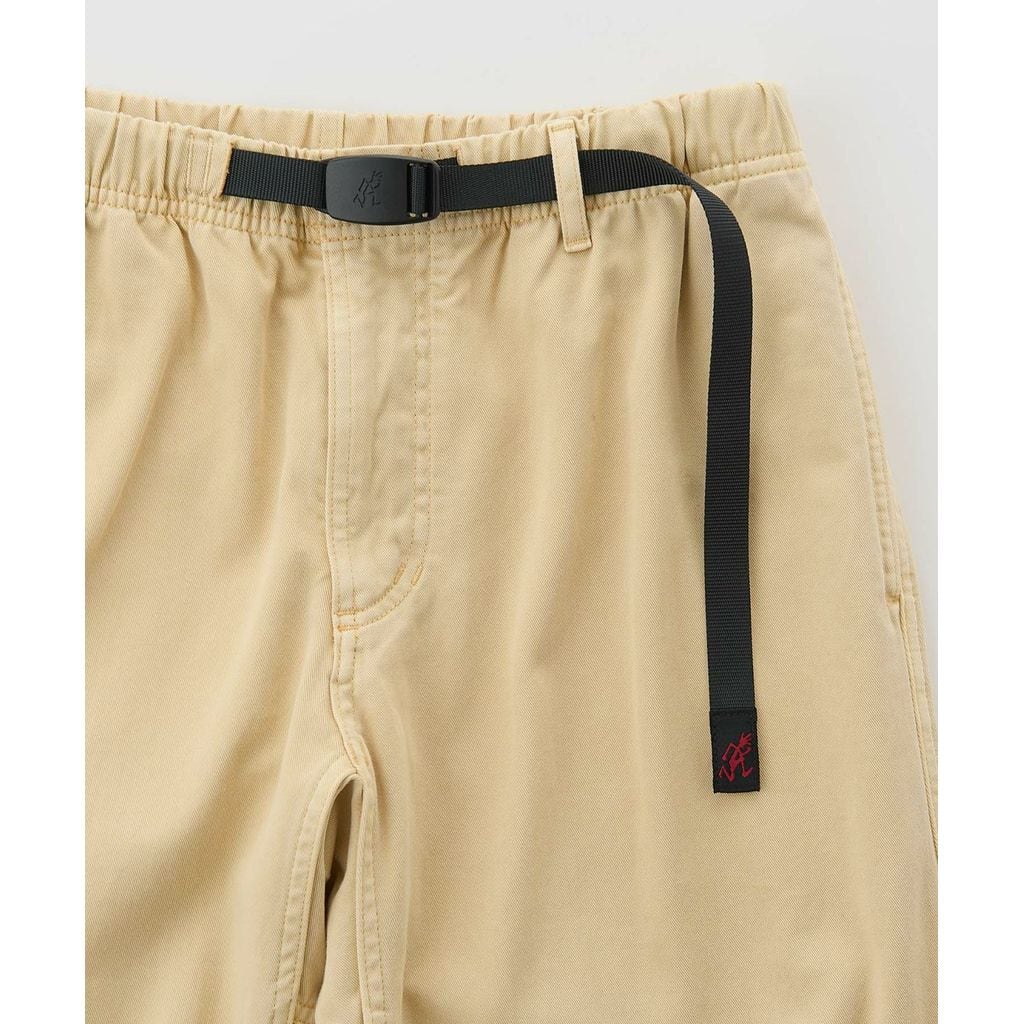 180度の開脚を可能としたガセットクロッチ、片手で調整できるウェビングベルト&イージーウェスト。1980年代、クライマーとしての体験をもとに、クライマーが欲しい機能をすべて具現した革新的なパンツとしてGRAMICCI PANTは誕生しました。裾にかけて細くなるテーパードシルエットのGRAMICCIパンツに比べ、腿から裾までに若干のゆとりを持たせたストレートシルエットです。耐久性が高く、ハリコシのある、激しい動きにも耐える、環境配慮エココットンツイルを使用し、雰囲気のある表情に染め上げています。