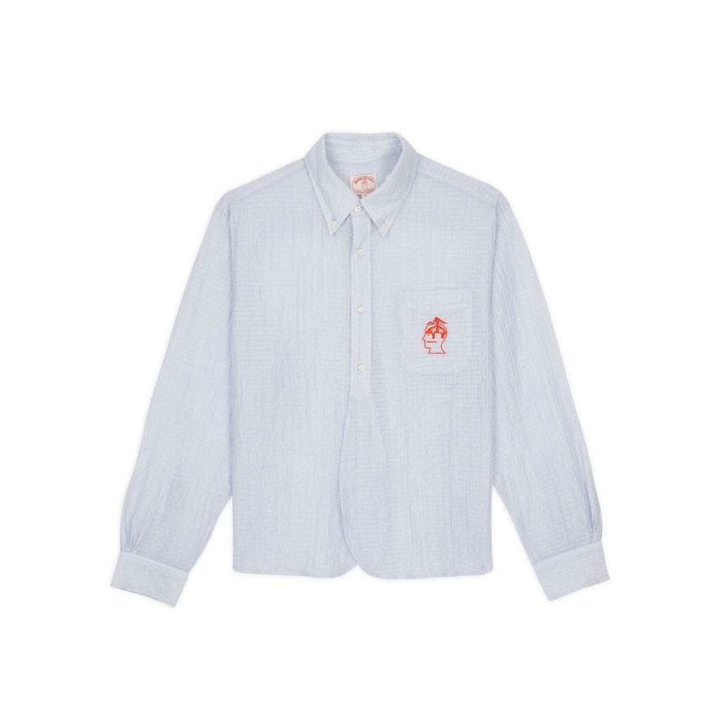ブルックス ブラザーズとのコラボレーションによる、コットンオックスフォード素材の長袖ハーフボタンアップ。ブルックス ブラザーズを象徴する襟と袖口、イレギュラーな前立て、そしてポケットには刺繍ロゴヘッドが特徴です。