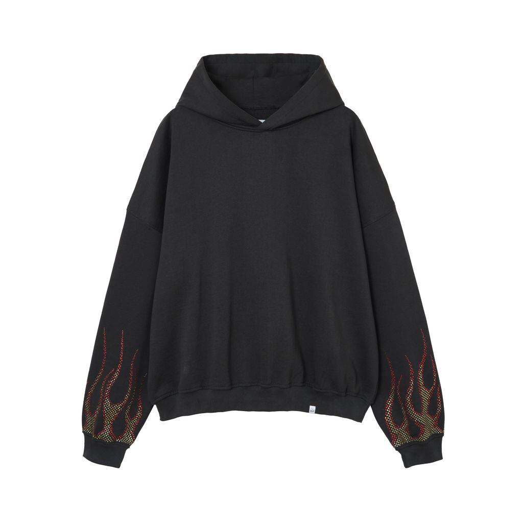 オリジナルで製作したぬめり感のある上質な裏毛を使用。背面のダーツや変形ポジションプリントなどブランドのらしさが詰まった製品にY2Kを思い出させるラインストーンをふんだんに使用してオリジナルで描き上げたファイヤーパターンを両袖に落とし込んだハードな印象の一枚。