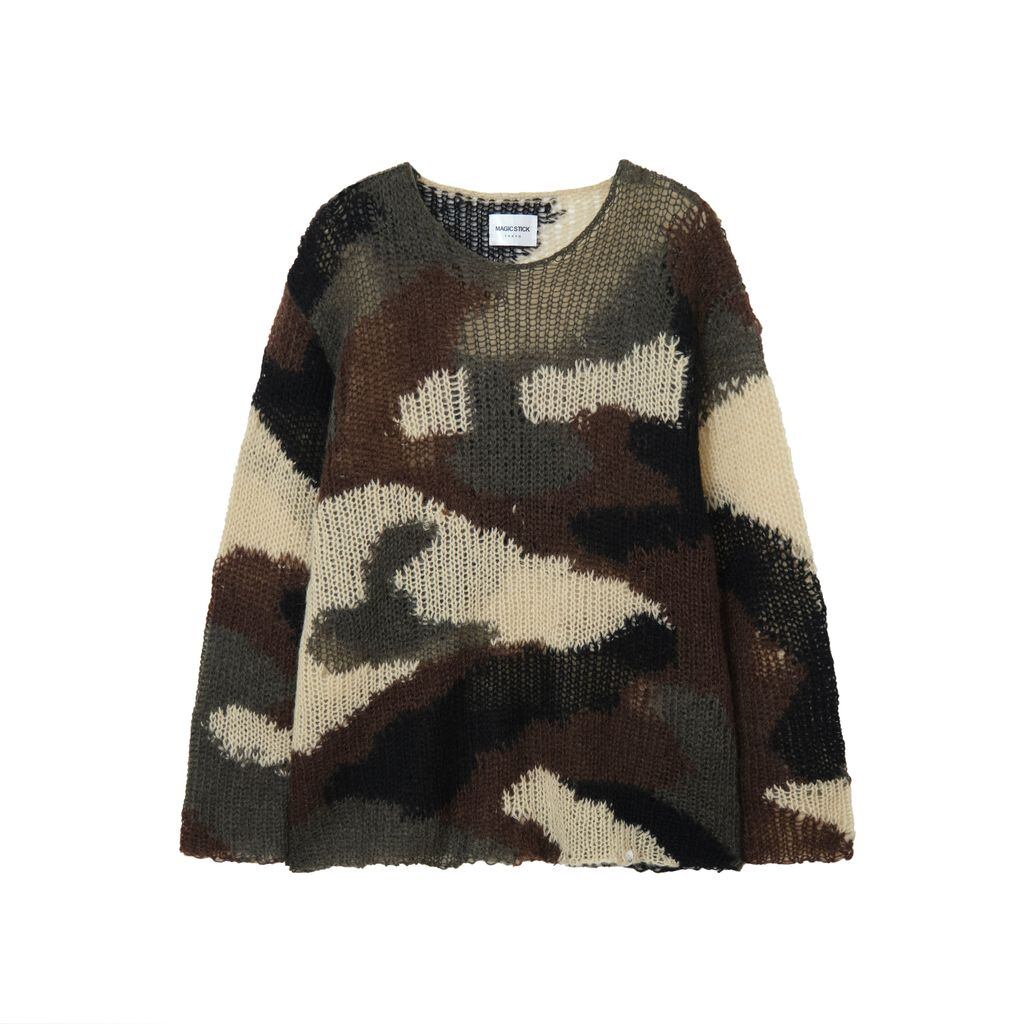 シルエットはゆったりとしたドロップショルダー型。襟と袖はあえてリブを排除し鉤針止めを採用することで、フェミニンな印象をプラス。カモフラージュパターンの迫力を程よく中和し、バランスの取れた一枚に。個性的でありながらどんなスタイルにも馴染む万能なニット。