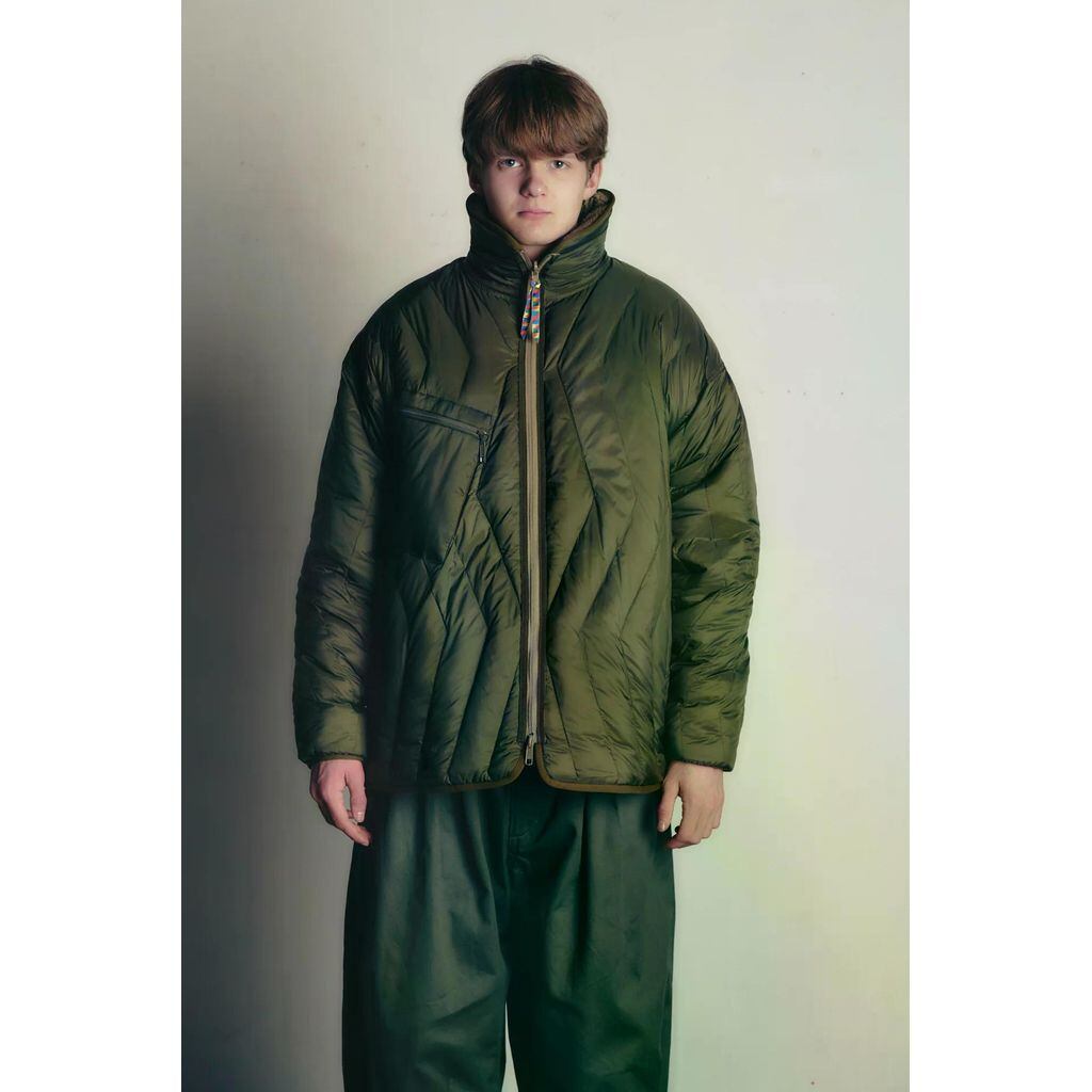 Light and warm reversible jacket is a collaboration item with TAION. The fleece side has a US ECWCS motif and the down quilted side has a GERMAN MILITARY motif. It is light and touchable because it uses ultra-light and resilient down with a very high temperature and humidity control function inherent in feathers. Warm even on windy days. Made of lightweight 800flp or more material with excellent resilience.