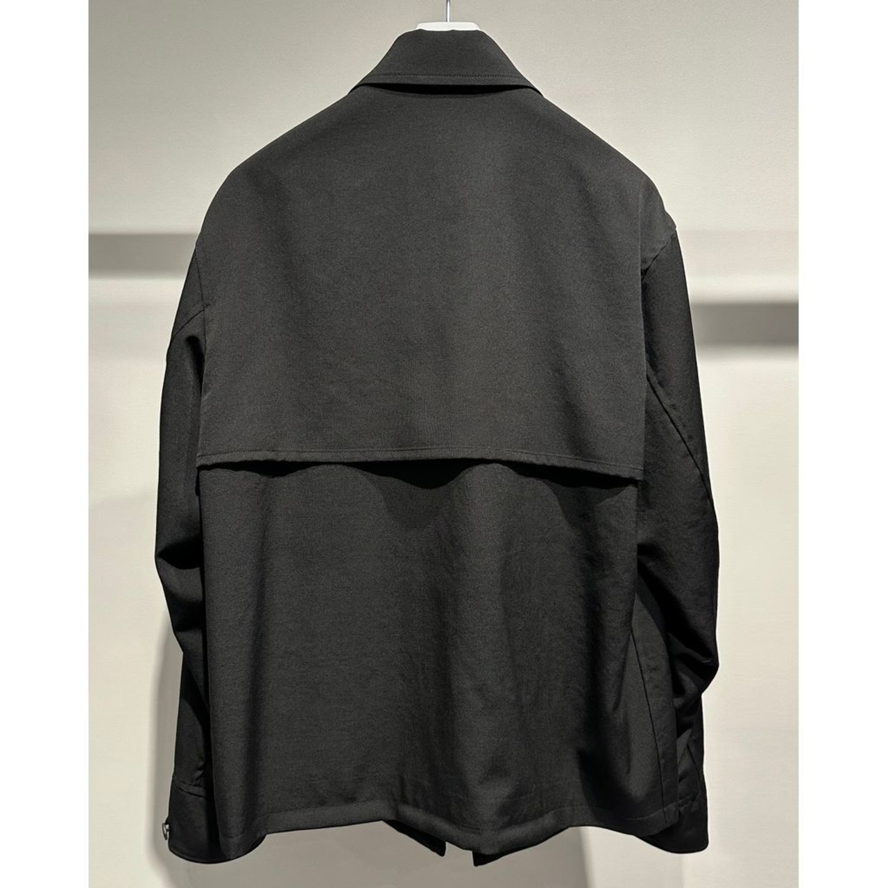 生地は、仕上げの工程でセット性を弱くすることにより織物に軽くシワやシボを付け、ウール本来の風合いに仕上げたヨウジヤマモト社の定番素材であるウールギャバジンを使用しています。フロントからバックまでを覆うように配された雨除けフラップが、そのまま胸ポケットのフラップにもなったデザインブルゾン。カジュアルなスタイリングに良くマッチします。