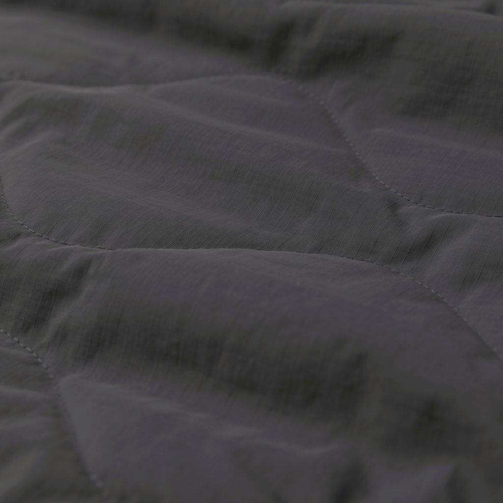表地・中綿ともにポリエステル素材で仕上げたフィールドライナージャケット。背面にMADNESSロゴを直刺繍、細かな運針で仕上げた瓢箪キルトを身頃全体に施し、左腕にフラップポケット、身頃の両脇にスラッシュポケットを配置したデザイン。袖口・裾はパイピング処理仕上げ、フロントはスナップボタンで開閉可能なイージーな仕様。ドロップショルダー、身幅にゆとりのあるシルエット。