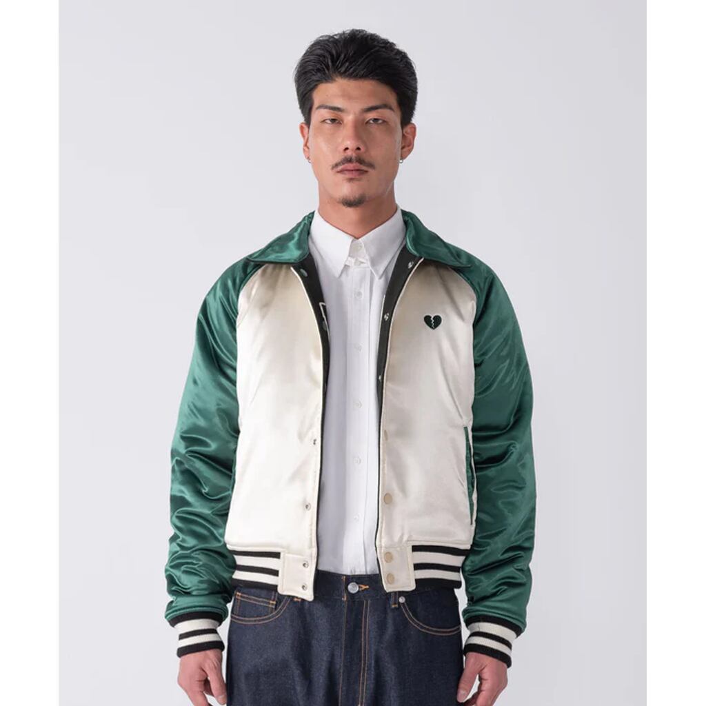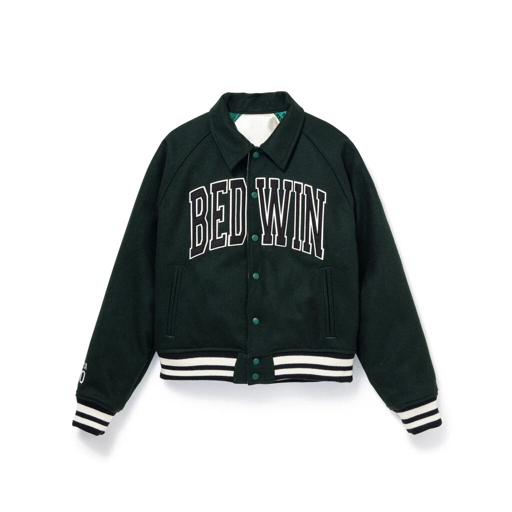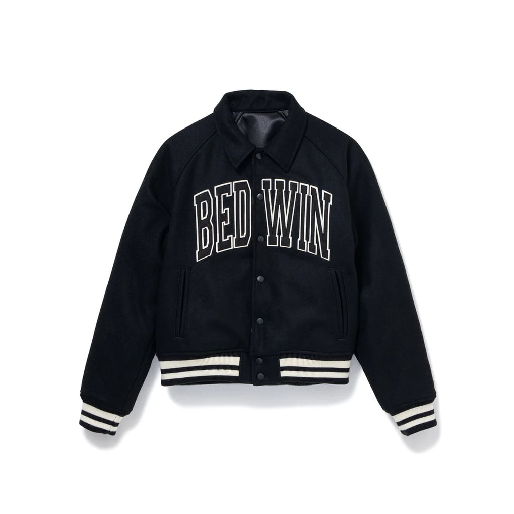 BEDWIN定番アイテムの一つアワードジャケットを今季はさらに着丈を短くすることで90年代のストリートの雰囲気を纏わせ、リバーシブル仕様に昇華。中肉厚なウールナイロンのメルトンを表に使用し、胸に大きくブランドロゴをフェルトワッペンで表現。左右の袖にはワンポイントの刺繍を配置。裏側は若干ストレッチ性のあるサテン生地を使用し、身頃と袖を配色にしている。左胸にワンポイントの刺繍を配置。