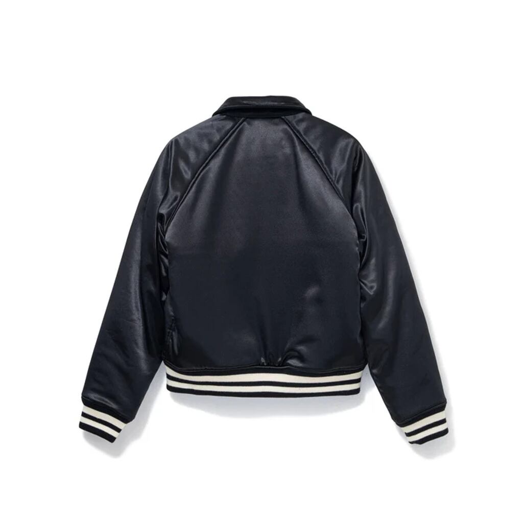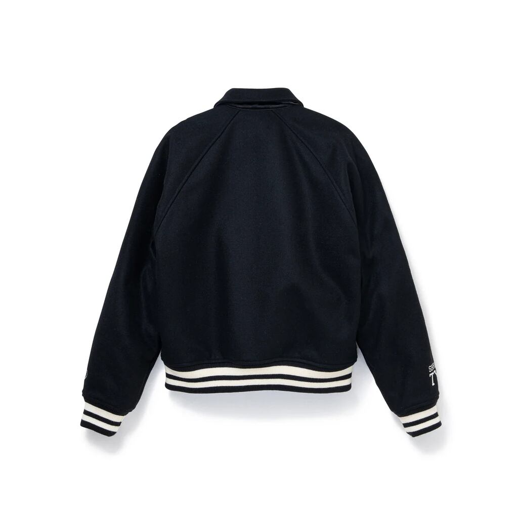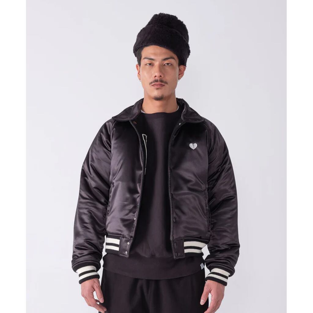 BEDWIN定番アイテムの一つアワードジャケットを今季はさらに着丈を短くすることで90年代のストリートの雰囲気を纏わせ、リバーシブル仕様に昇華。中肉厚なウールナイロンのメルトンを表に使用し、胸に大きくブランドロゴをフェルトワッペンで表現。左右の袖にはワンポイントの刺繍を配置。裏側は若干ストレッチ性のあるサテン生地を使用し、身頃と袖を配色にしている。左胸にワンポイントの刺繍を配置。