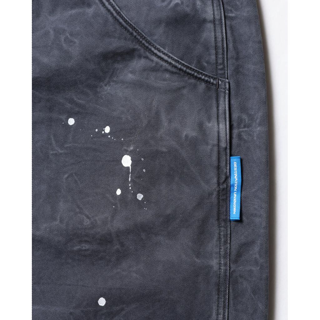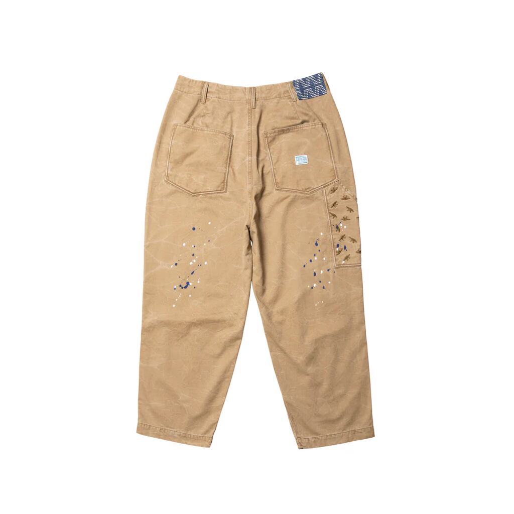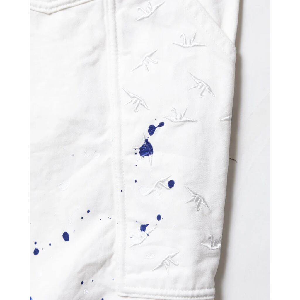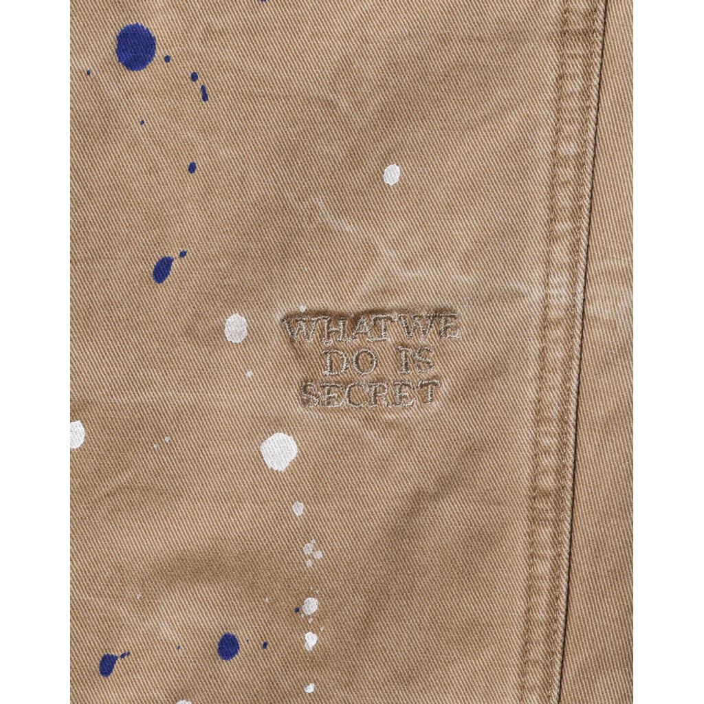 左腿にWHAT WE DO IS SECRETの同色刺繍が入ります。背面のスパナポケットには折り鶴同色刺繍が総柄で入ります。全体にペンキ飛ばしが入ります。