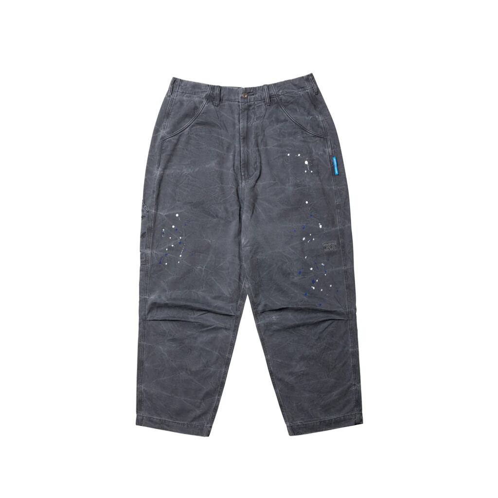 硫化染料のコットンツイルを使用し職人の手で独特の加工感に仕上げたサルエルチノペインターパンツ。特殊な洗いによって独特のシワ感を出しています。