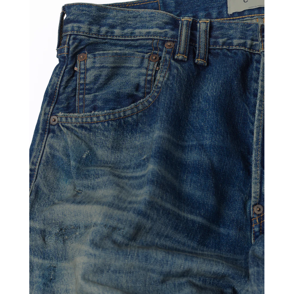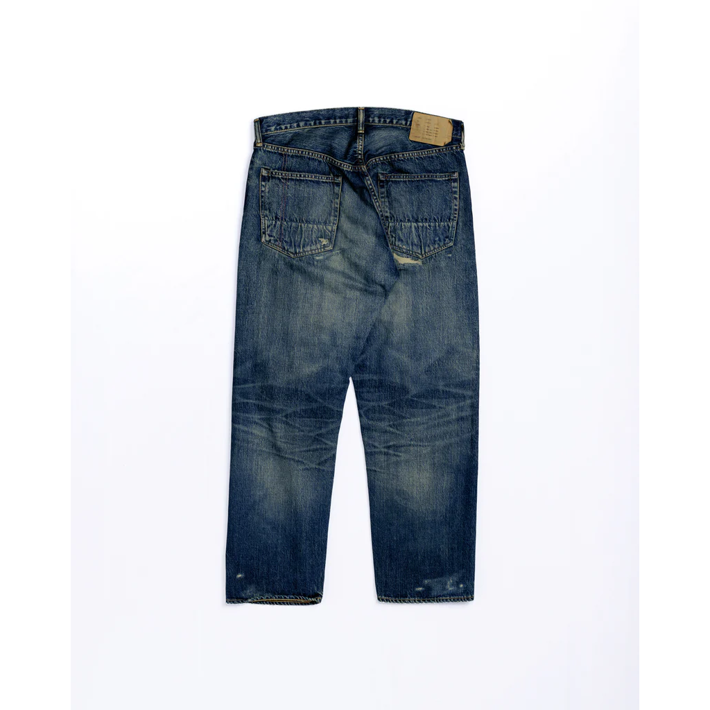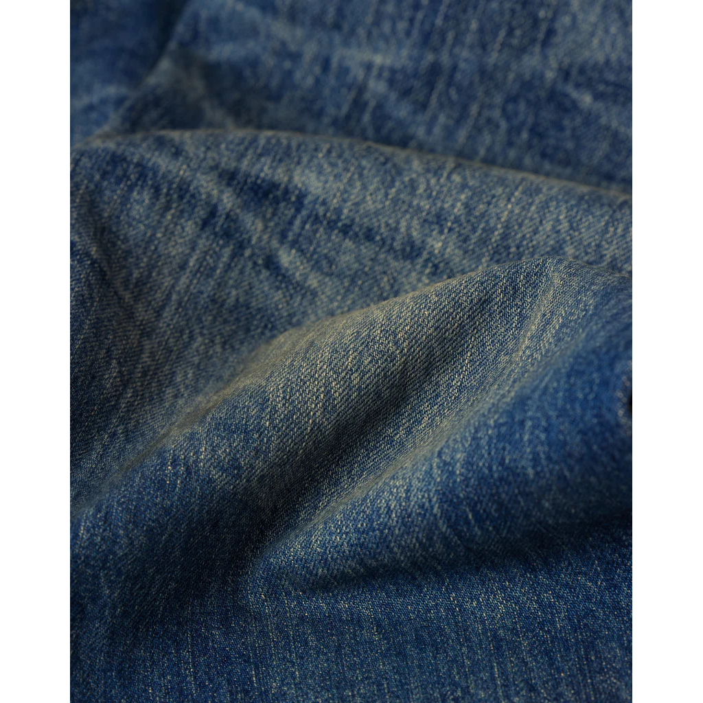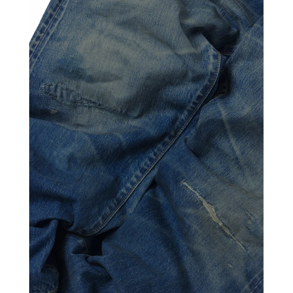 Features an overall faded wash with high-contrast honeycombs and whiskers. This piece captures an authentic vintage feel with meticulously repaired "time-worn" damages. A final tinting process is applied to give it a realistic, lived-in grit.