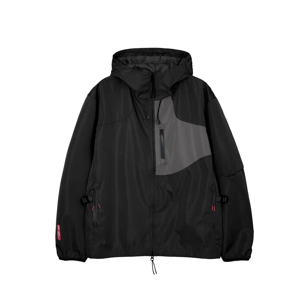 デザイン面では、フロントチェストにカラーブロッキングのジップポケットを配置し、コントラストの効いた視覚的アクセントをプラス。さらにウエストにはテープアジャスターを備え、シルエットの変化も楽しめるギミックを加えている。