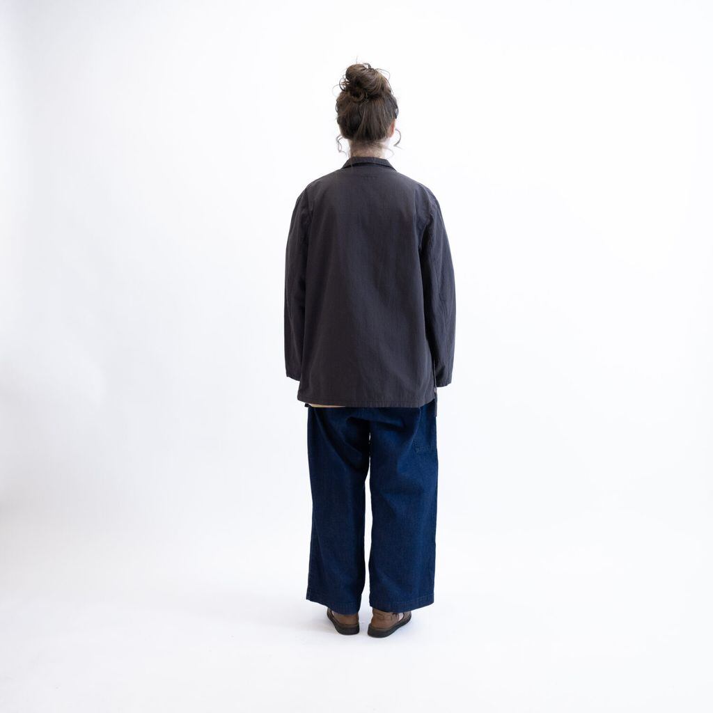 生地は、カツラギ組織でデニムらしい表情ですが、番手や打ち込み本数などを工夫することで軽さを実現しています。