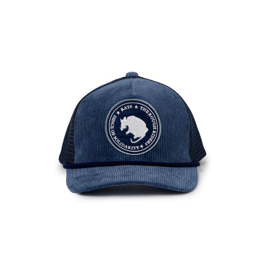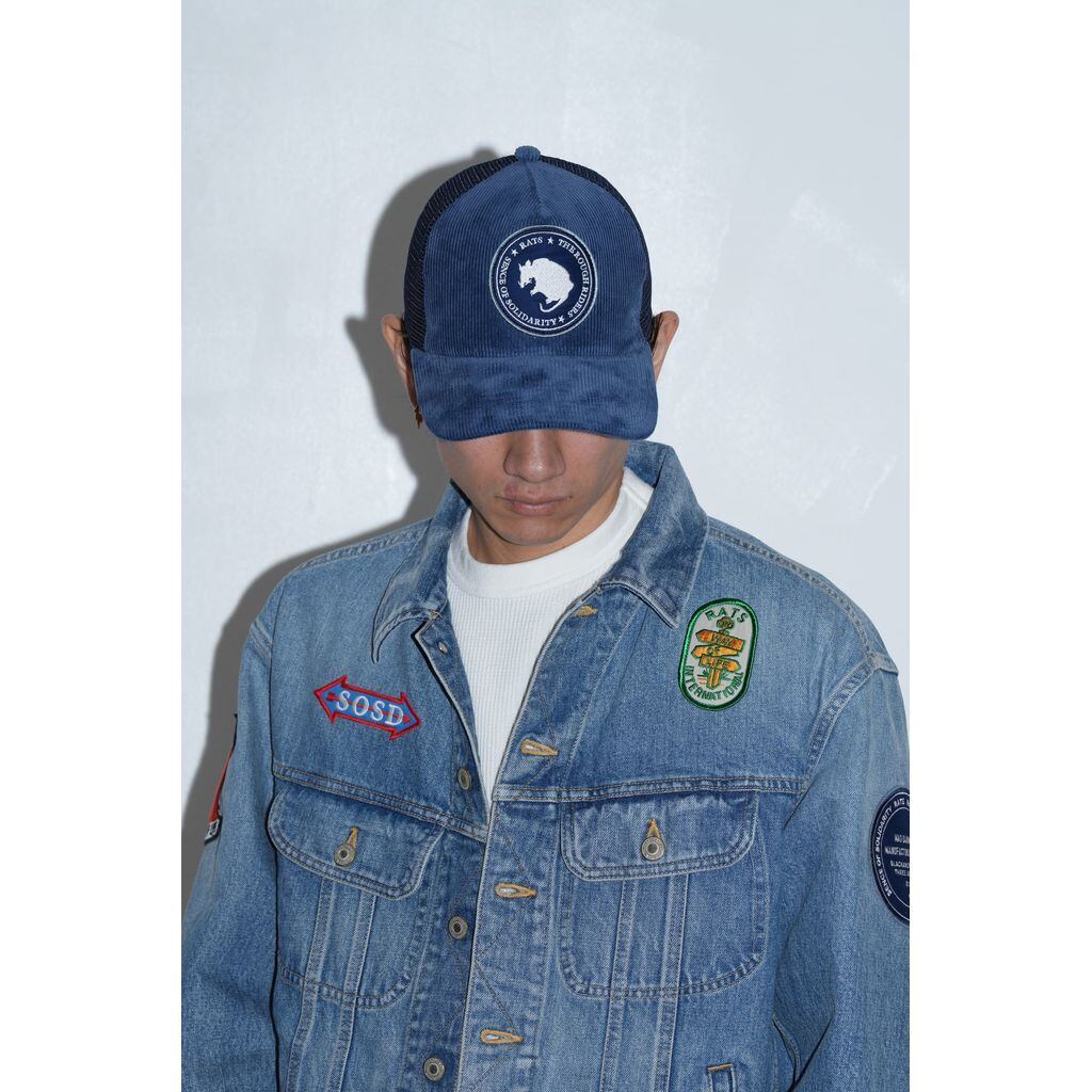 オリジナルで染色した11ウェルの太畝コーデュロイ素材を使用したトラッカーキャップ。フロントパネルに大ぶりなサイズで作成したRATモチーフを中央に配したサークル型ワッペンを叩きつけ、後部中央にスナップバックを付属、サイズ調整が可能な仕様。1色、1サイズ展開。