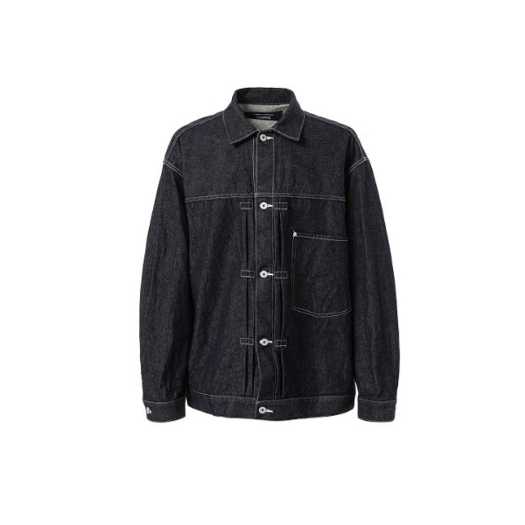 ワンポケットタイプのデニムトラッカージャケットをコム デ ギャルソン・オムらしくモディファイしたジャケットは全体的にビックシルエットにデザイン。ゆったりとドロップしたショルダーに同じくゆったりとした身幅、それらに合わせて設定された着丈のバランスがただのオーバーサイズでは無く、計算されたビックシルエットを生み出します。ワンウォッシュのインディゴデニムにホワイトのステッチ、COMME des GARCONS HOMMEの刻印が入ったオリジナルのドーナツボタンなど細かなディテールにも抜かりの無いジャケットです。