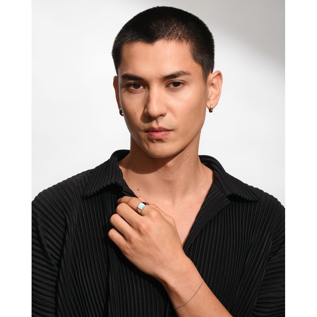 ケイリング アイスブルーは、トム・ウッドの定番デザインであるミディアムサイズのシグネットリングです。磨き上げられたカスタムカットのラリマーストーンが、洗練されたシルバーのベゼルに手作業でセッティングされています。