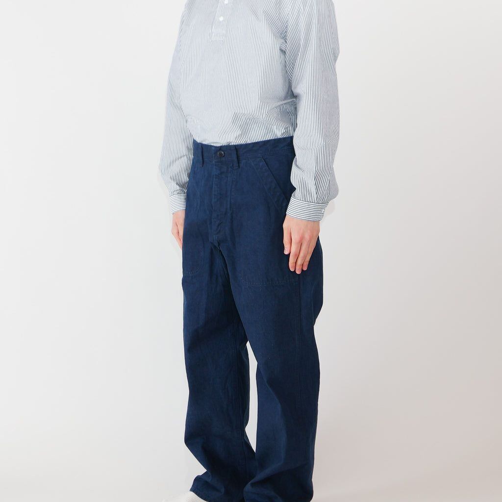 40年代にアメリカの海軍で使われていた作業用のパンツをモチーフにして、大人がリラックスして着ることのできるパンツを作りました。L字型のステッチの入った大きなフロントポケットと、ラウンドしたバックポケットが特徴です。