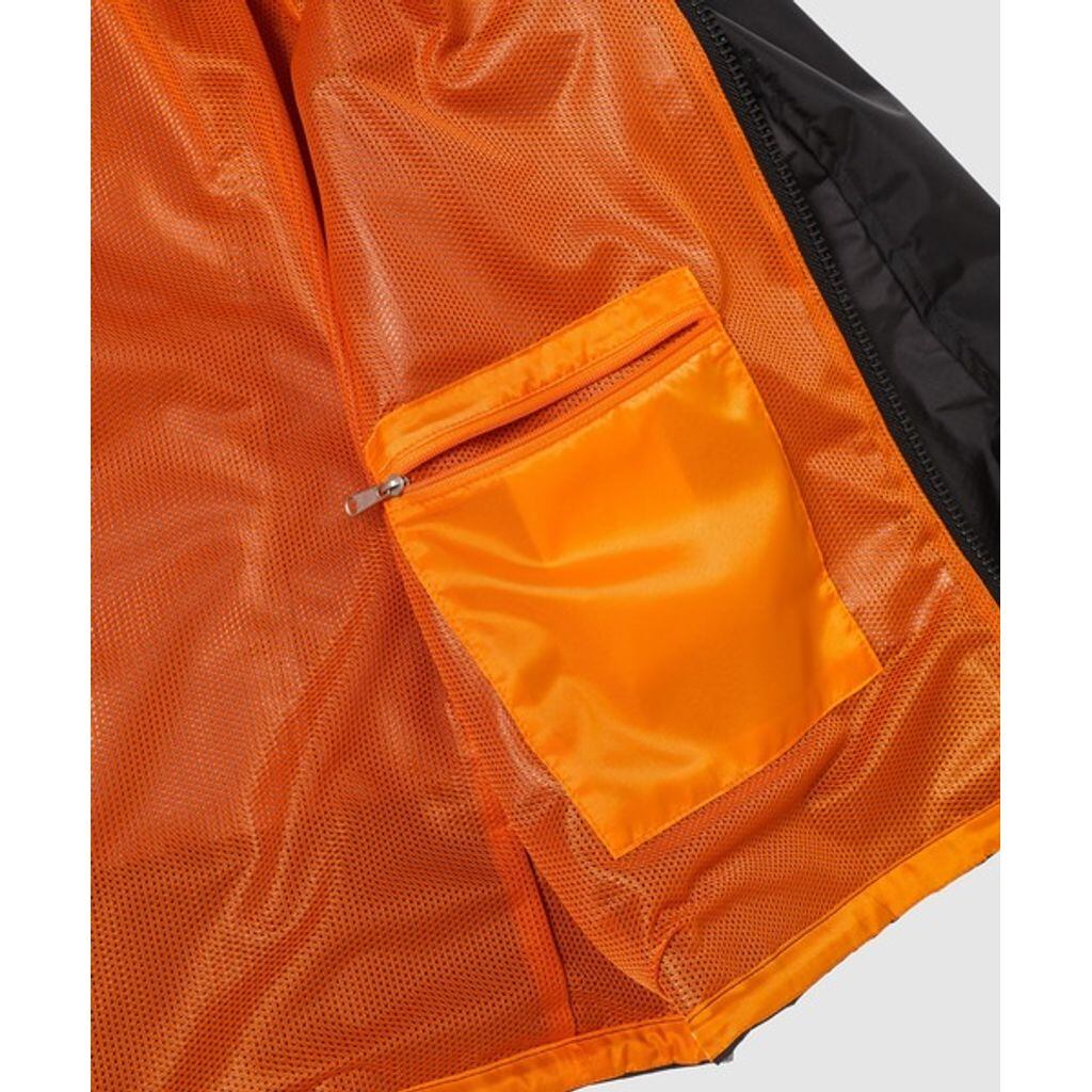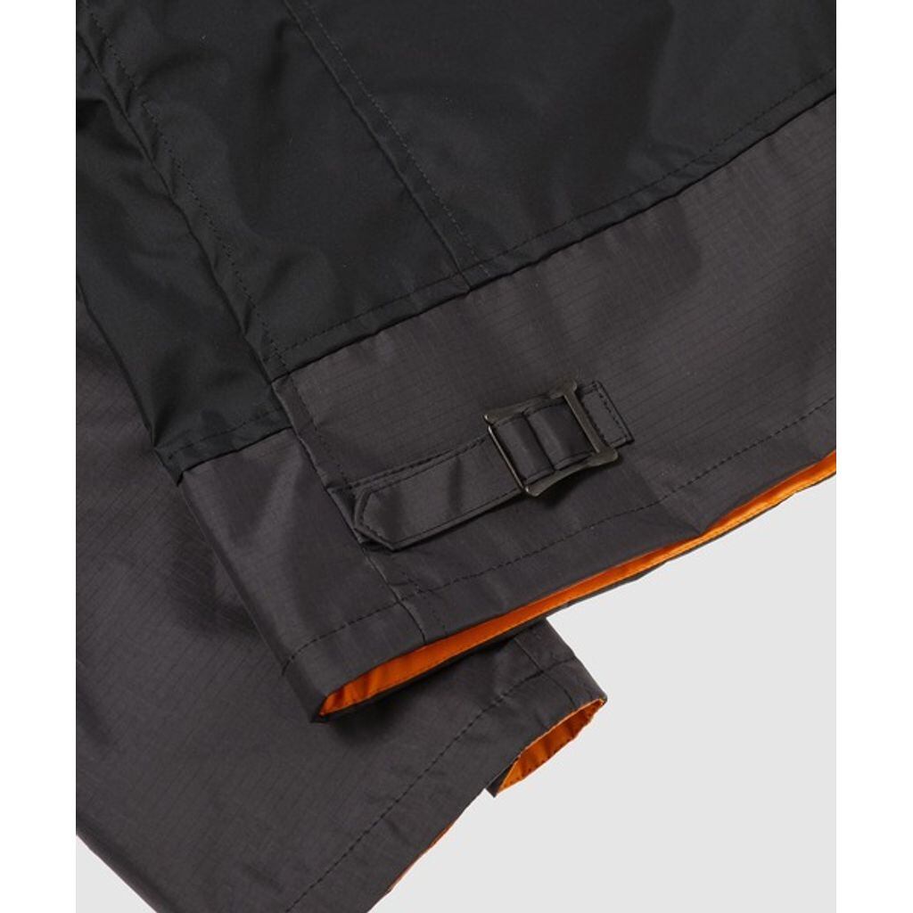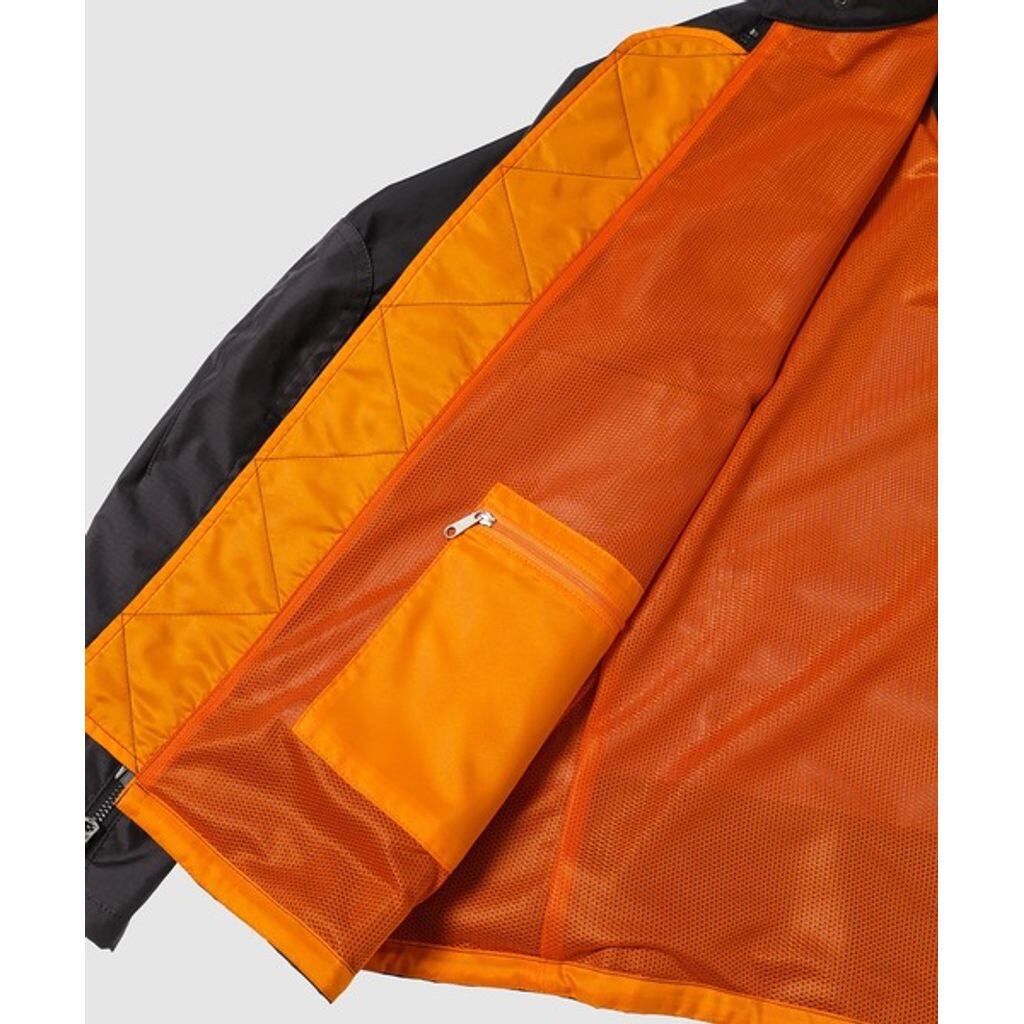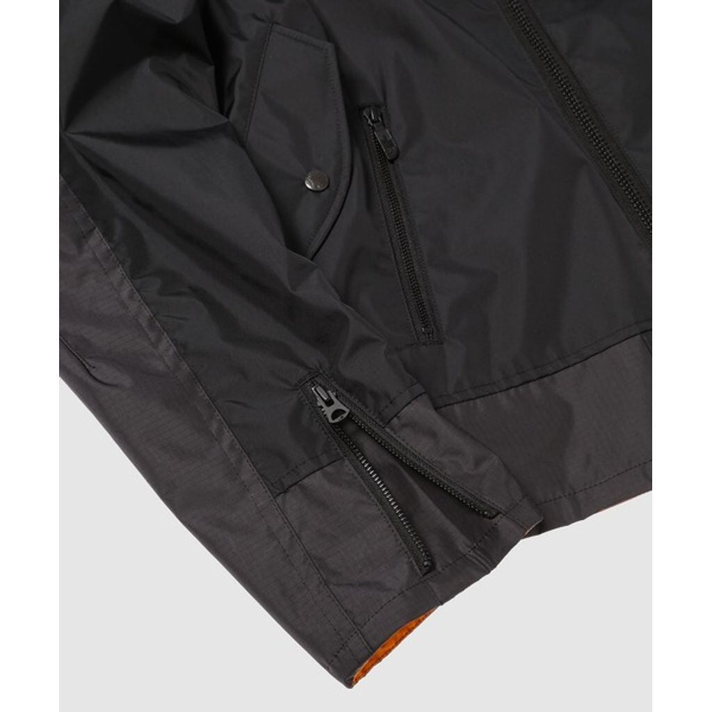 eYe JUNYA WATANABE MANとTHE NORTH FACEとのコラボレーションによるジャケットはミリタリーのMA-1フライトジャケットとシングルタイプのライダースジャケットをMIXさせたデザイン。MA-1の様なナイロン素材にフラップ付きのポケット、左袖に加えられたシガーポケットなどのMA-1ならではのデザインにシングルライダースによるスタンドカラーや袖口のジップデザインなど2種類の象徴的なデザインがMIXされています。生地にはノースフェイスならではのテック素材であるGORE-TEXを使用し、防水性・撥水性に優れた素材感が特徴となったまさにコラボレーションならではの一枚です。