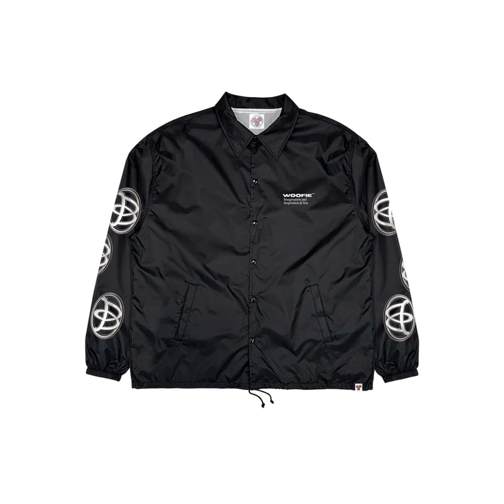 Woofieとのコラボレーション。ナイロン100% の定番のコーチジャケット。 ボディと袖にフランネルの裏地付き。メカニックのピットクルーが着ているイメージ。スクリーンプリント。