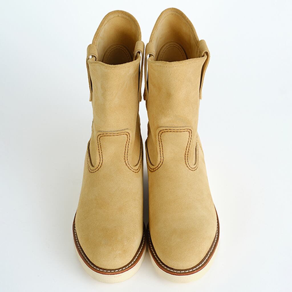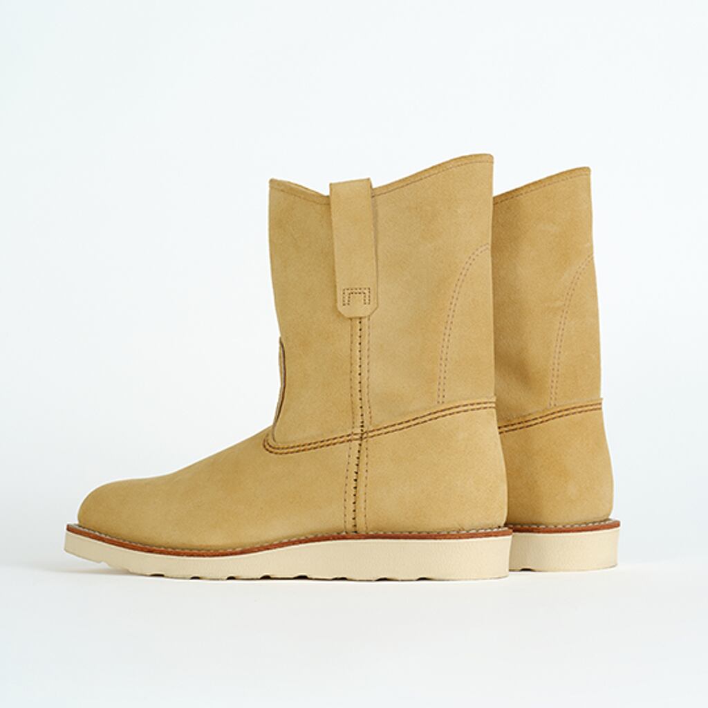 レッドウィング社はかつてテキサスに拠点を持ち、1930年代にはウエスタンブーツも販売していました。このウエスタンブーツにレッドウィング社が得意とする機能本位のワークブーツのデザイン手法を用いて、シンプルかつ頑丈で様々なワークに使えるブーツとしたものがペコスブーツです。