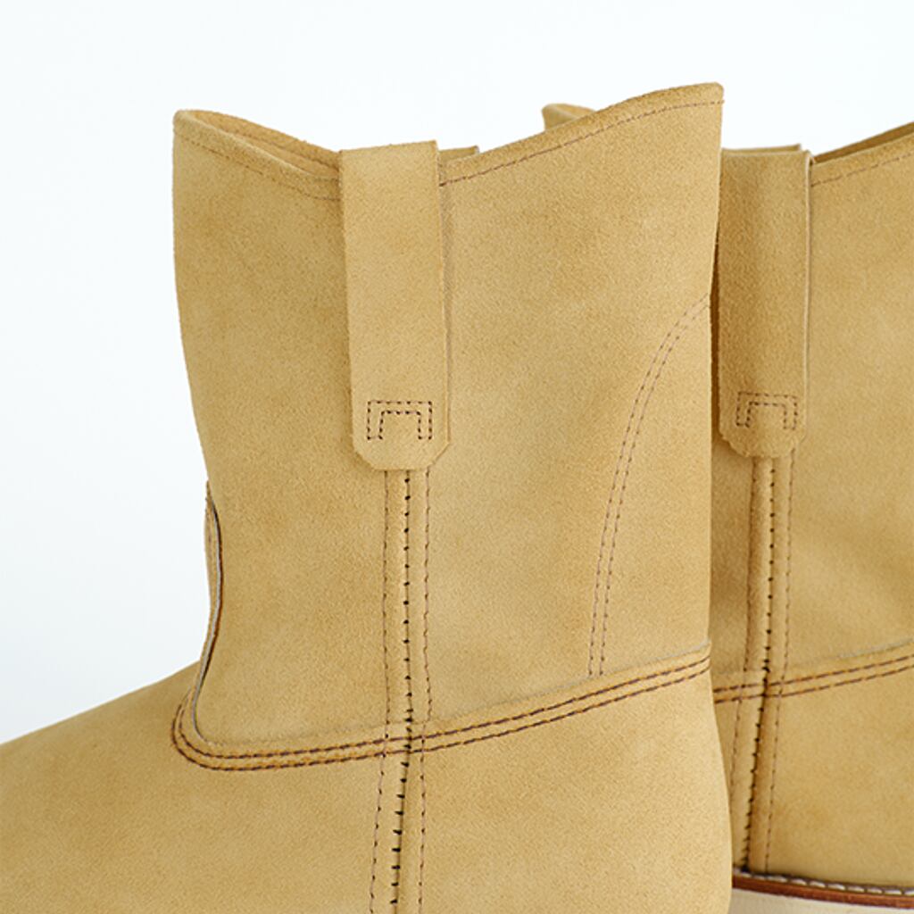 ペコスブーツはレッドウィング社の開発した、ウエスタンブーツタイプのワークブーツです。元々スペインの乗馬靴に由来するウエスタンブーツは、左右両側に縫い目のあるサイドシームの筒を持つプルオンブーツで、その多くはつま先がやや尖った形をして高めのヒールがついています。これは乗馬の際に鐙(あぶみ)にスムーズに足を入れて踏ん張るのに適していたからです。
