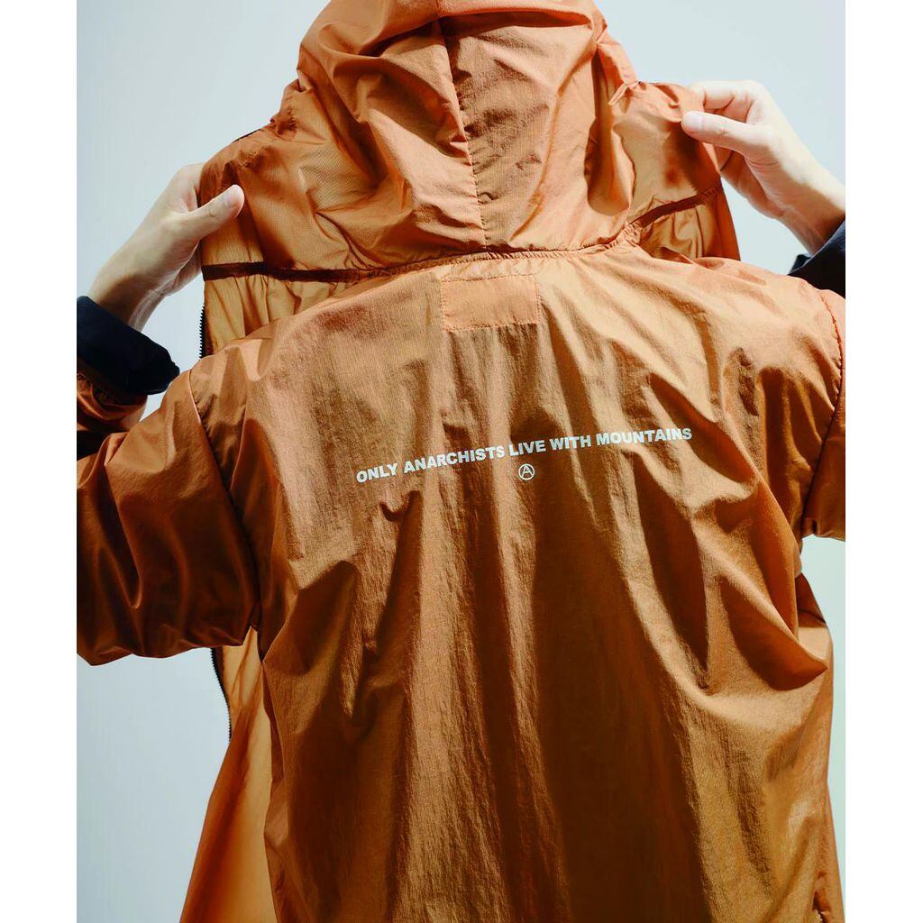 2年ぶりのリリースとなるウィンドブレーカーフーディー。フードとカフスにはおなじみのストレッチバインディングを継承しつつ、今季は裾をコードアジャスト仕様にアップデート。軽量かつ高い撥水性を誇る、リサイクルマイクロリップナイロンを採用した頼れる機能素材も健在です。背面には“Only Anarchists live with Mountains”のプリント入り。