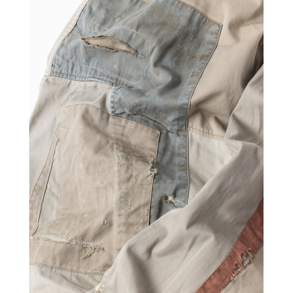 Possessing an appearance that evokes the history of repeated tearing and repairing, these pants feature the most elaborate and detailed remake process in this season's collection.