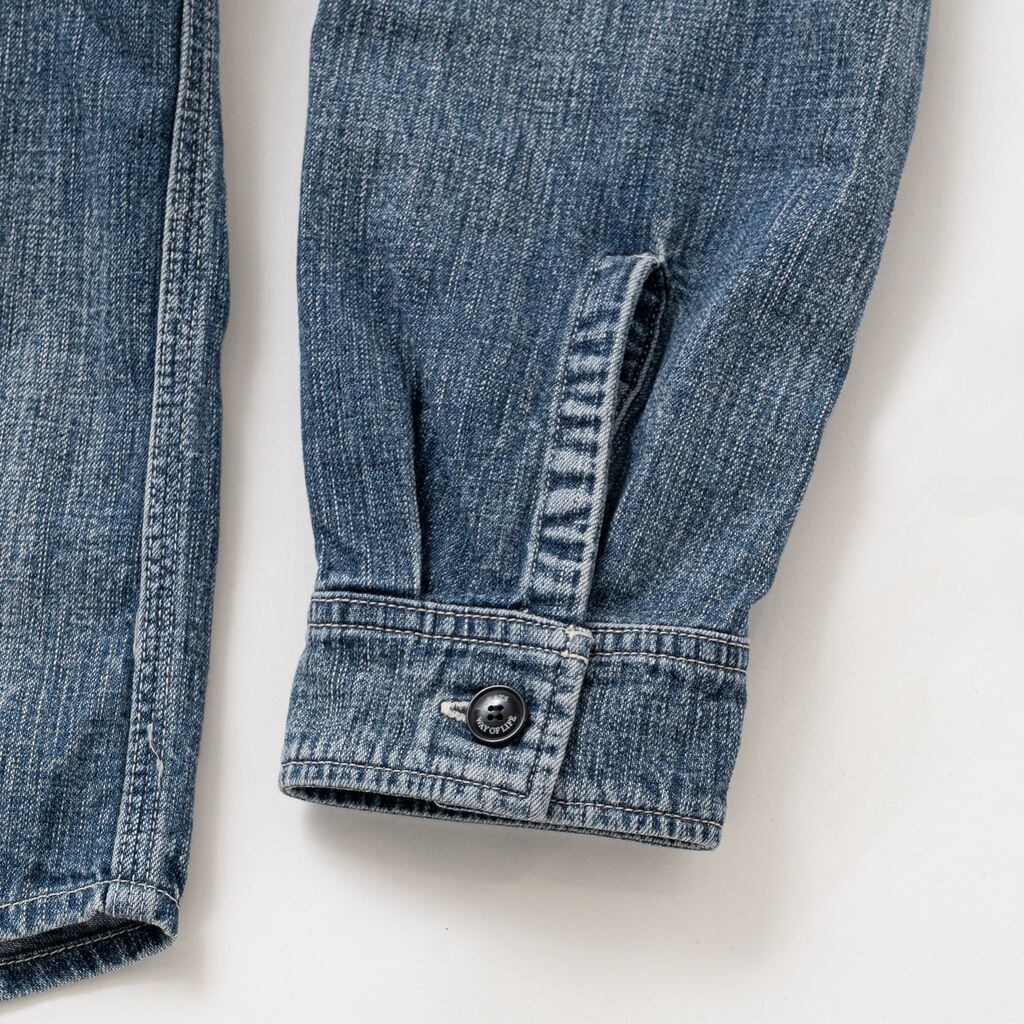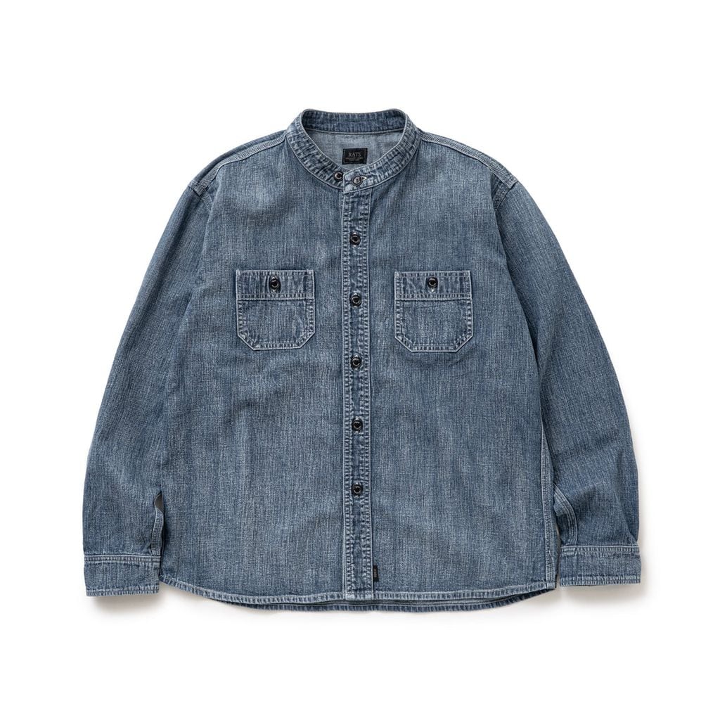 9oz.のデニム素材を使用したスタンドカラーデニムシャツ。身頃全体にユーズド加工を施し、ヴィンテージ特有のドライタッチでフェードした質感を表現したデザイン。両胸にボタン留め仕様のフラップポケット、襟にはボタンを2連で配置、肩・脇・袖・背面などテンションのかかる箇所はすべて3本針仕上げ、などクラシックなワークウェアに見られる意匠を採用したデザイン。ボタンパーツはすべて“RATS”・“WAY OF LIFE”の刻印入りのオリジナル、前立て裾上にピスネームを挟み込み。レギュラーフィットシルエット。1色、5サイズ展開。
