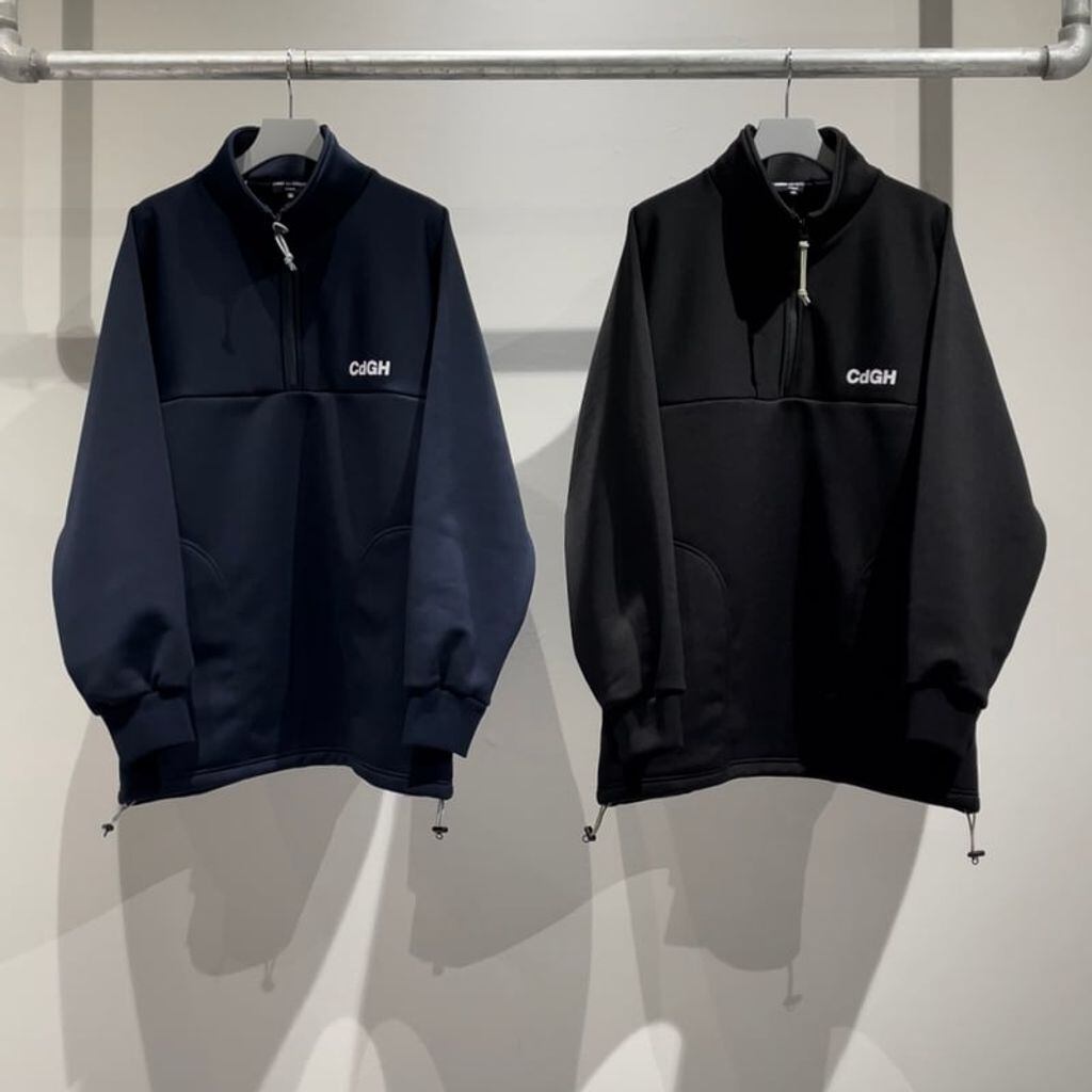 センタージップによるプルオーバータイプのブルゾンは素材にジャージを使用したライトな一枚。裏毛仕様となった裏地による着心地の良さも魅力です。また胸元にはCOMME des GARCONS HOMMEのイニシャル「CdG H」をプリント。シンプルなデザインに胸元のグラフィックがアクセントになっています。