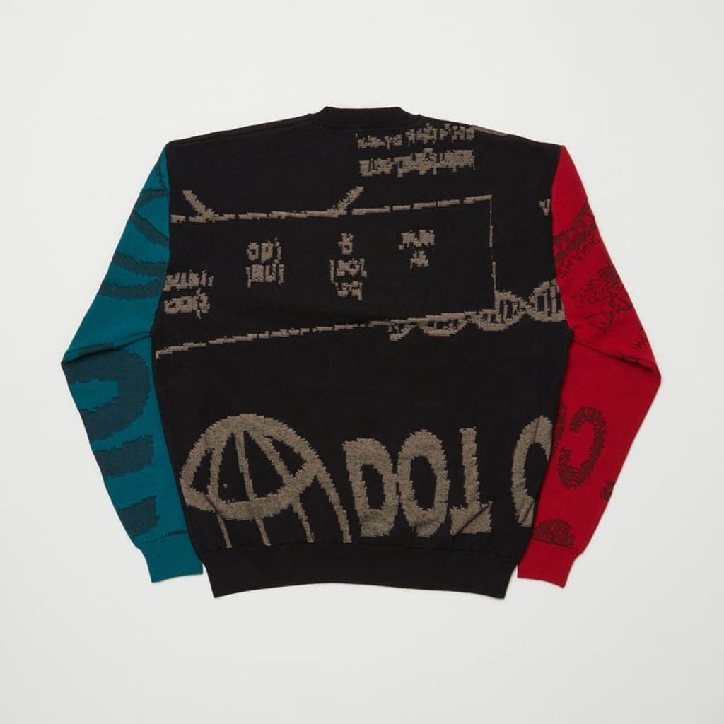 ミドルゲージのコットンクルーネックセーター。前身頃、後身頃、両袖パーツにジャカード織りによるシーズナブルグラフィックデザイン。リブとヘムはリブ編み。リラックスシルエット。