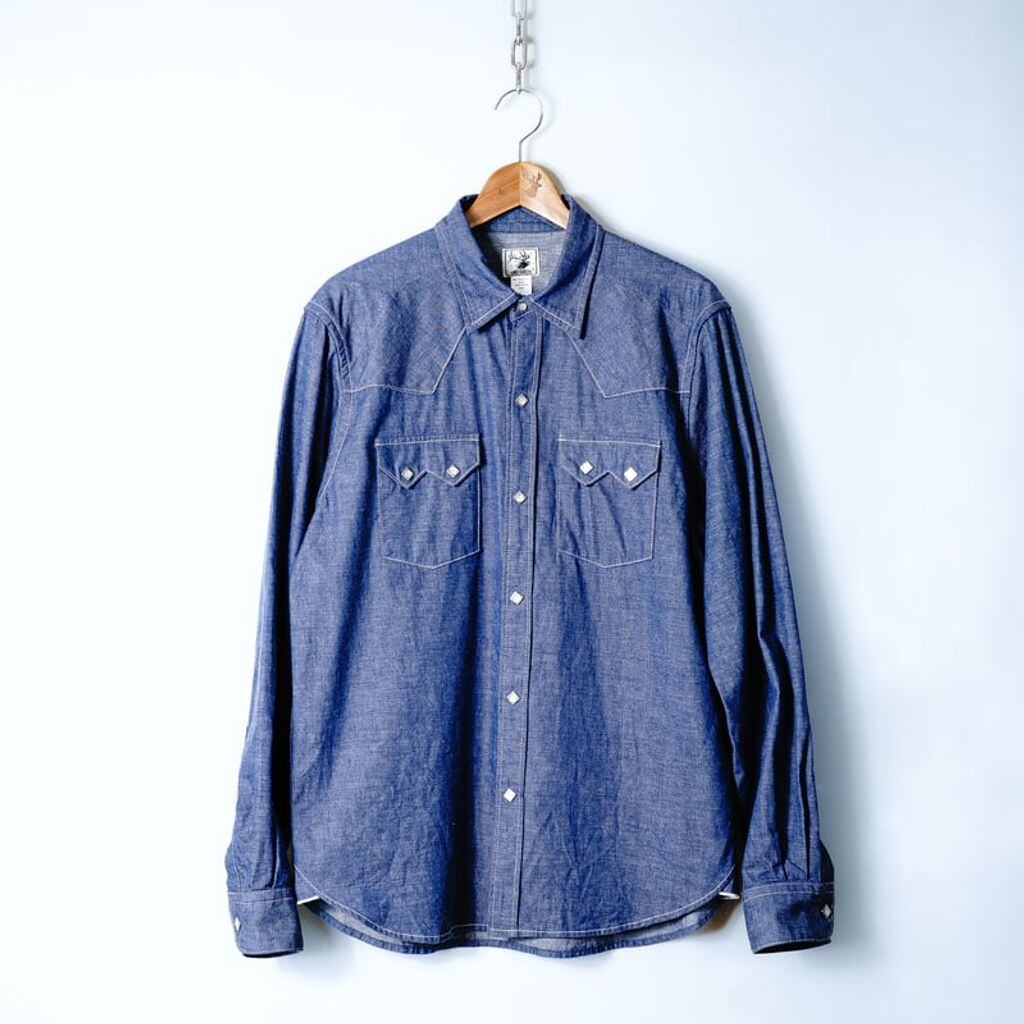 タテヨコムラ糸を使い織り上げた中肉のセルビッチ素材を使用し製作したウエスタンシャツ。ムラ糸の風合いと旧力織機にてゆっくりと織り上げる事によりヴィンテージ感ある風合いになり、ソフトな着心地で通年着用できる シャツとして重宝します。